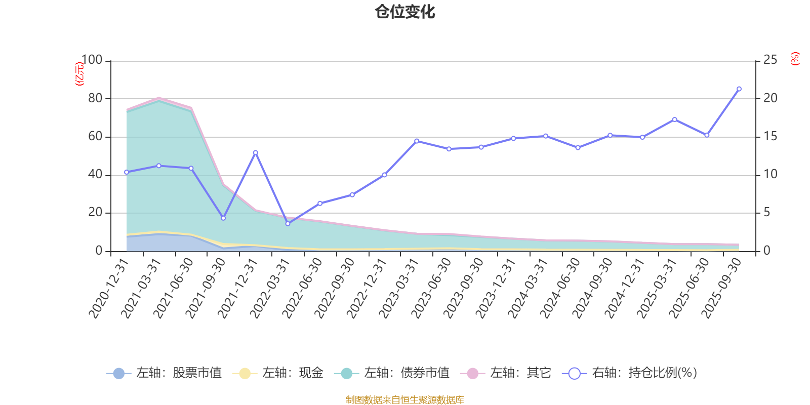 据定期报告数据统计,近三年平均股票仓位为14.93%,同类平均为19.03%。2025年三季度末基金达到21.31%的最高仓位,2022年一季度末最低,为3.63%。
