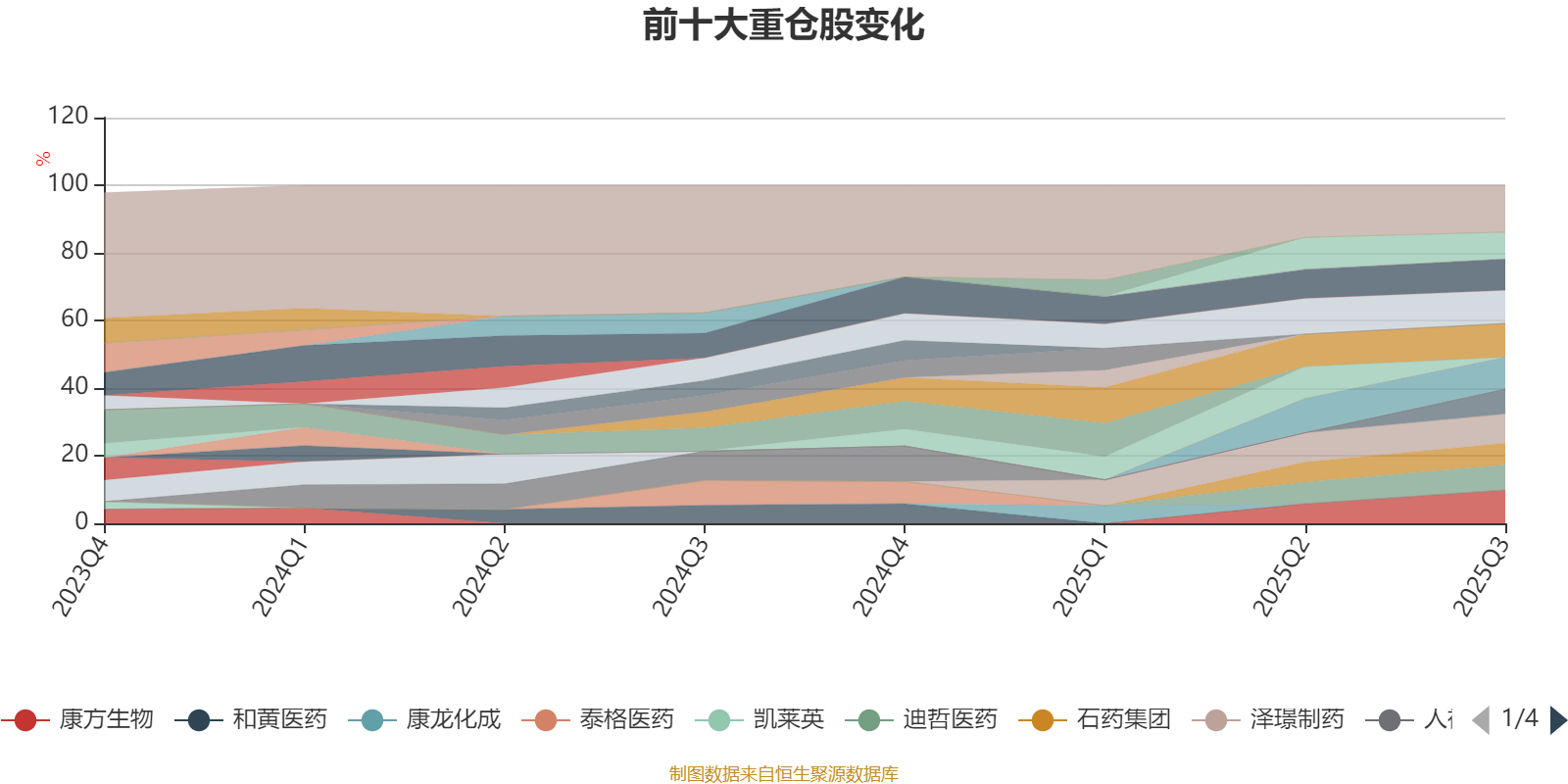 该基金持股集中度较高,近2年前十大重仓股集中度长期超过60%。截至2025年三季度末,基金十大重仓股分别是科伦博泰生物-B、康方生物、信达生物、三生制药、恒瑞医药、泽璟制药、益方生物、迪哲医药、诺诚健华、石药集团。