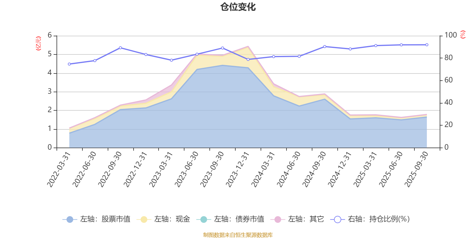 据定期报告数据统计,近三年平均股票仓位为85.75%,同类平均为86.81%。2025年三季度末基金达到91.92%的最高仓位,2022年一季度末最低,为74.68%。