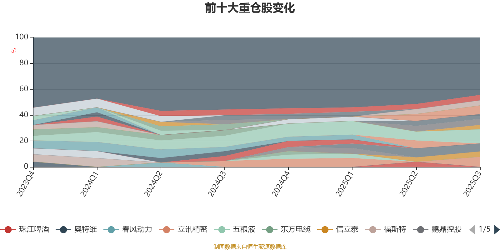 截至2025年三季度末,基金十大重仓股分别是宁德时代、立讯精密、恺英网络、海大集团、潮宏基、信立泰、惠泰医疗、东鹏饮料、燕京啤酒、生益科技。