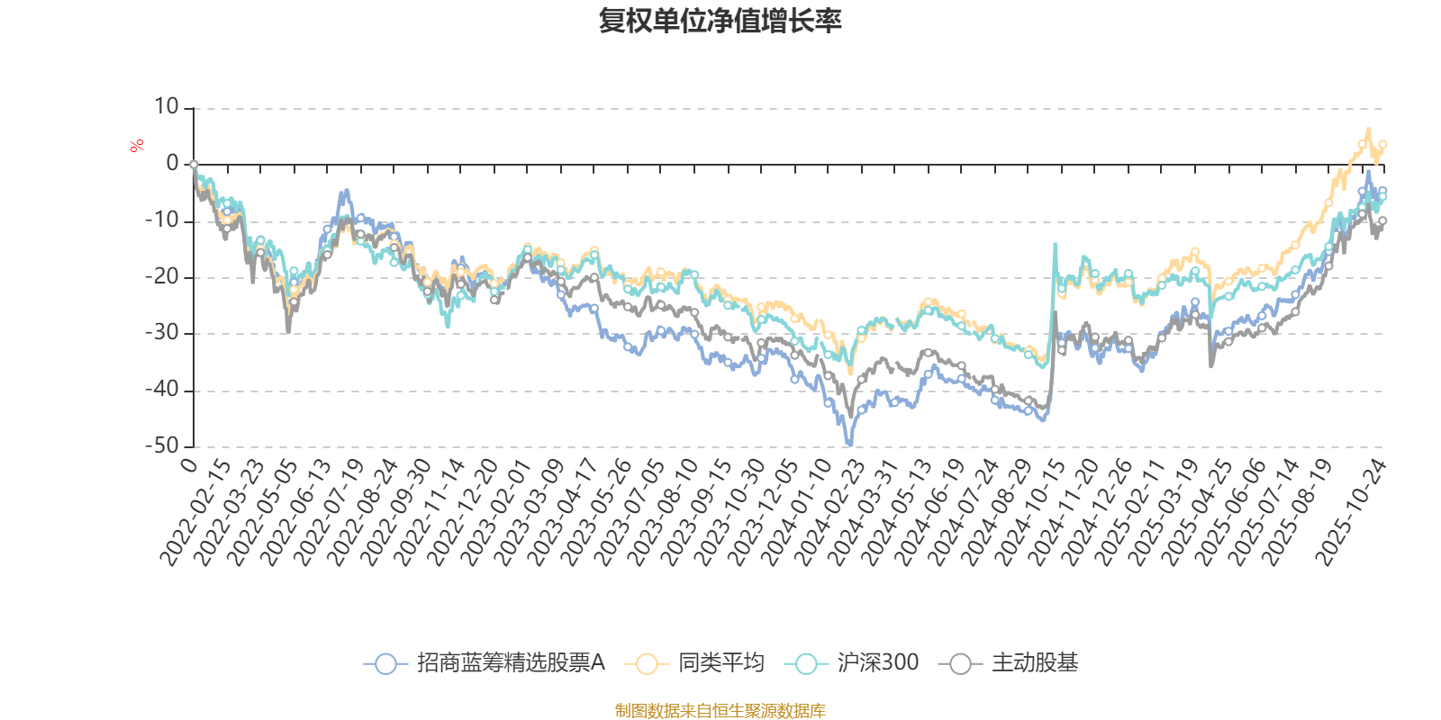 截至10月24日,招商蓝筹精选股票A近三个月复权单位净值增长率为18.35%,位于同类可比基金24/58;近半年复权单位净值增长率为34.62%,位于同类可比基金19/57;近一年复权单位净值增长率为38.33%,位于同类可比基金20/57;近三年复权单位净值增长率为23.75%,位于同类可比基金32/56。