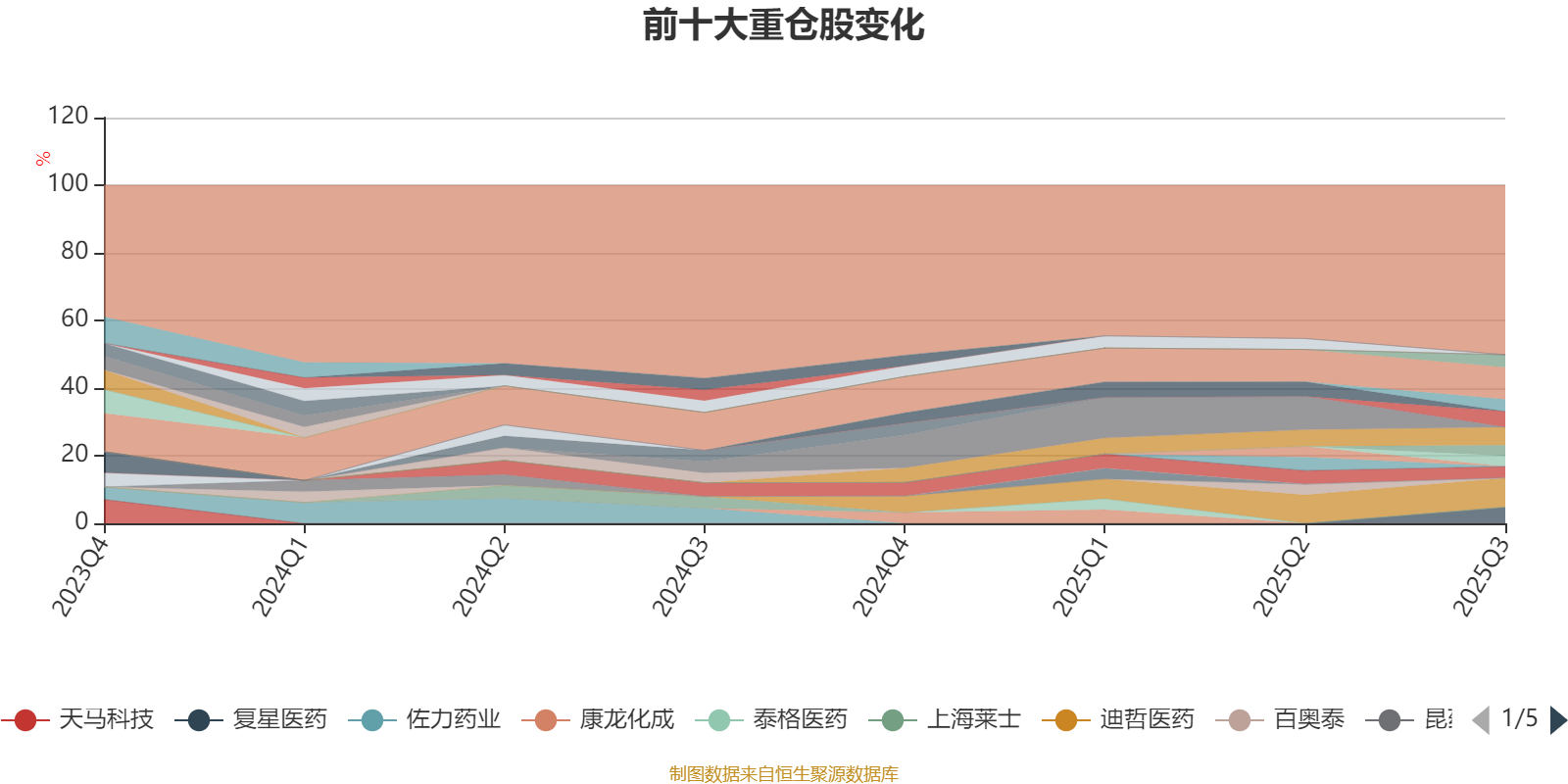 截至2025年三季度末,基金十大重仓股分别是恒瑞医药、迪哲医药、首药控股、复星医药、我武生物、奕瑞科技、乐普医疗、甘李药业、联影医疗、长春高新。