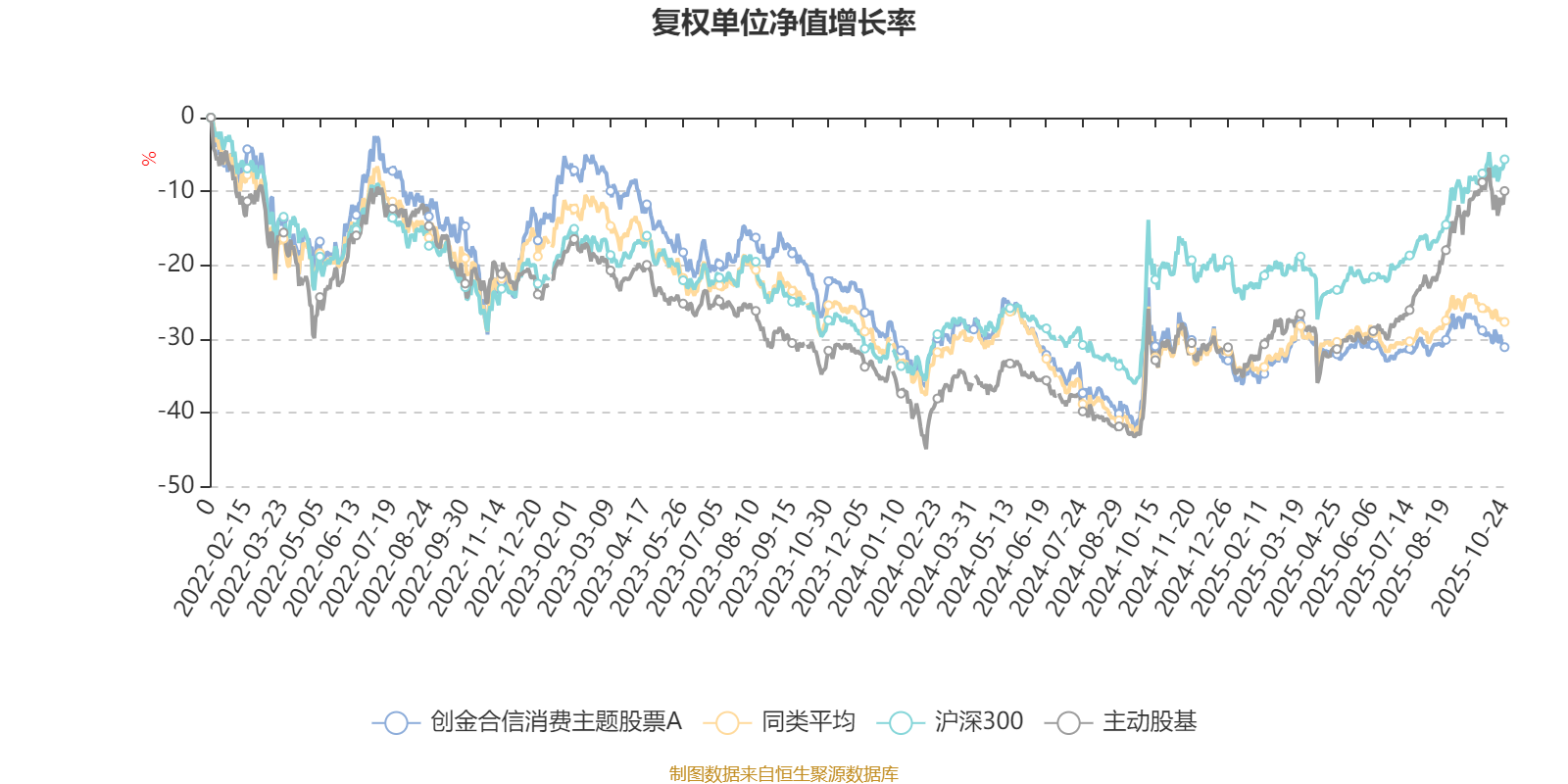截至10月24日,创金合信消费主题股票A近三个月复权单位净值增长率为-1.86%,位于同类可比基金35/43;近半年复权单位净值增长率为1.60%,位于同类可比基金24/43;近一年复权单位净值增长率为-1.70%,位于同类可比基金34/43;近三年复权单位净值增长率为-8.24%,位于同类可比基金26/40。