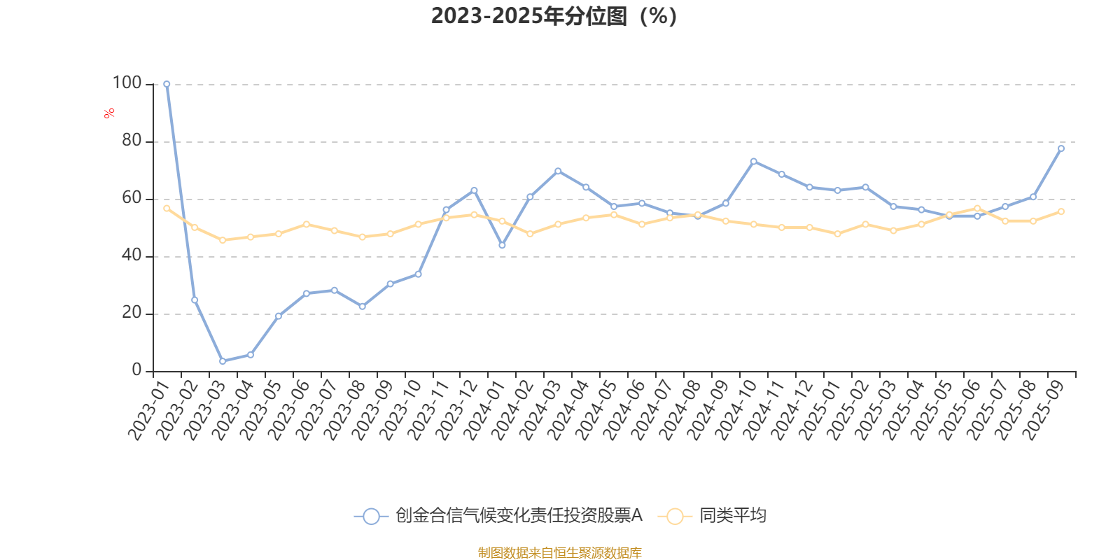 通过所选区间该基金净值增长率分位图,可以观察该基金与同类基金业绩比较情况。图为坐标原点到区间内某时点的净值增长率在同类基金中的分位数。
