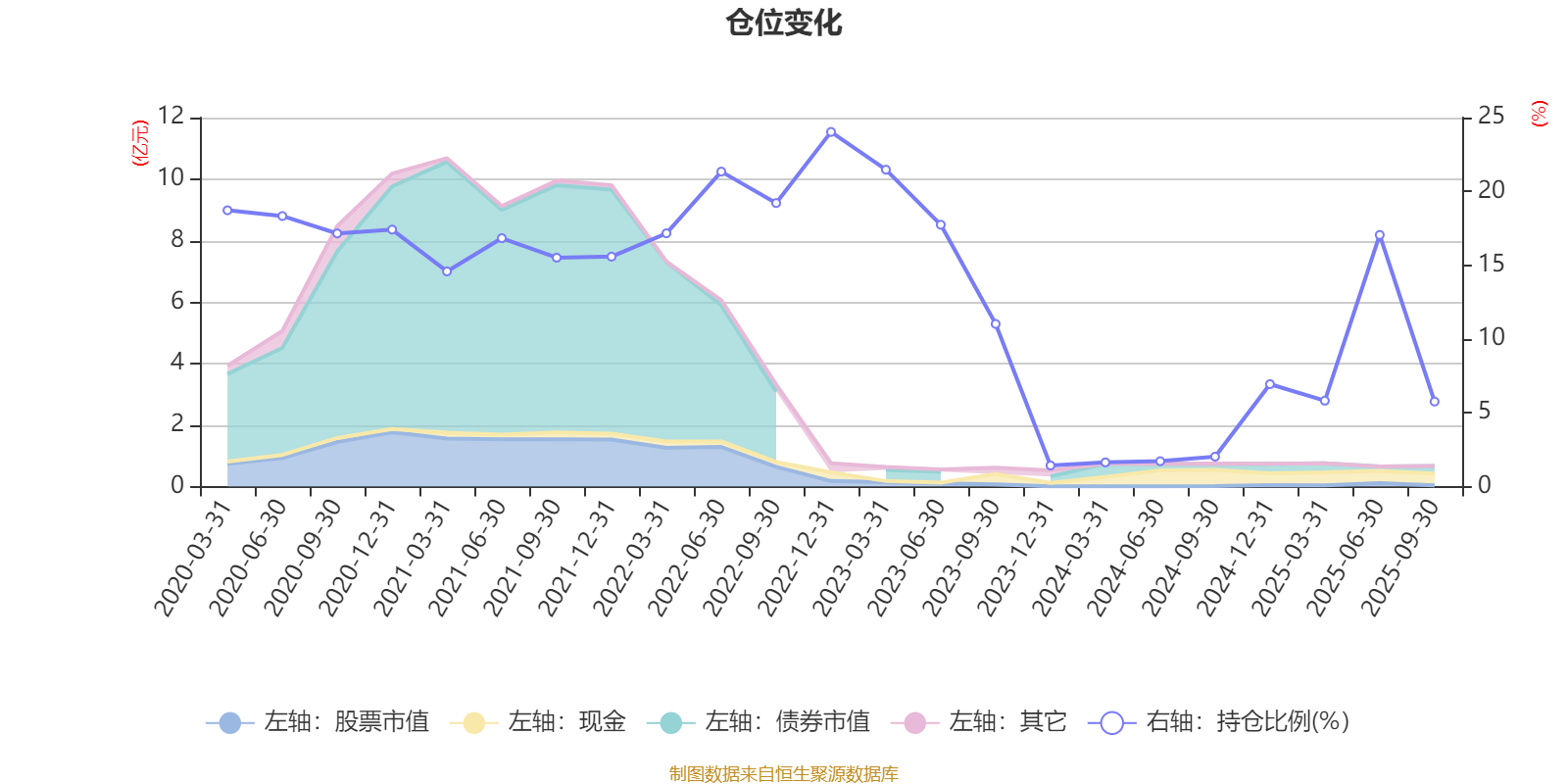 据定期报告数据统计,近三年平均股票仓位为9.72%,同类平均为19.03%。2022年末基金达到24.03%的最高仓位,2023年末最低,为1.43%。