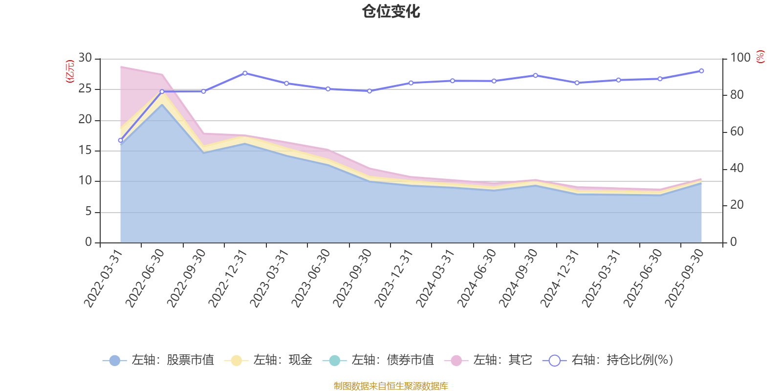 据定期报告数据统计,近三年平均股票仓位为87.99%,同类平均为85.86%。2025年三季度末基金达到93.38%的最高仓位,2022年一季度末最低,为55.64%。
