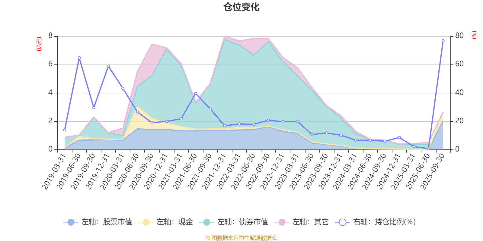 据定期报告数据统计,近三年平均股票仓位为14.92%,同类平均为72.16%。2025年三季度末基金达到76.77%的最高仓位,2025年上半年末最低,为0.62%。