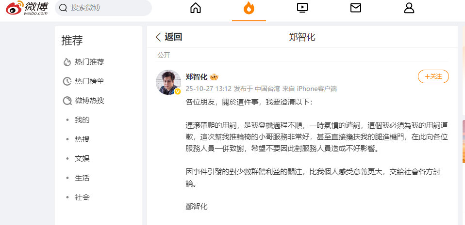 每经AI快讯,10月27日中午,台湾歌手郑智化在微博就此前登机事件进行澄清:“连滚带爬的用词,是我登机过程不顺,一时气愤的遣词,这个我必须为我的用词道歉,这次帮我推轮椅的小哥服务非常好,甚至直接搀扶我的腿进机门,在此向各位服务人员一并致谢,希望不要因此对服务人员造成不好影响。因事件引发的对少数群体利益的关注,比我个人感受意义更大,交给社会各方讨论。”