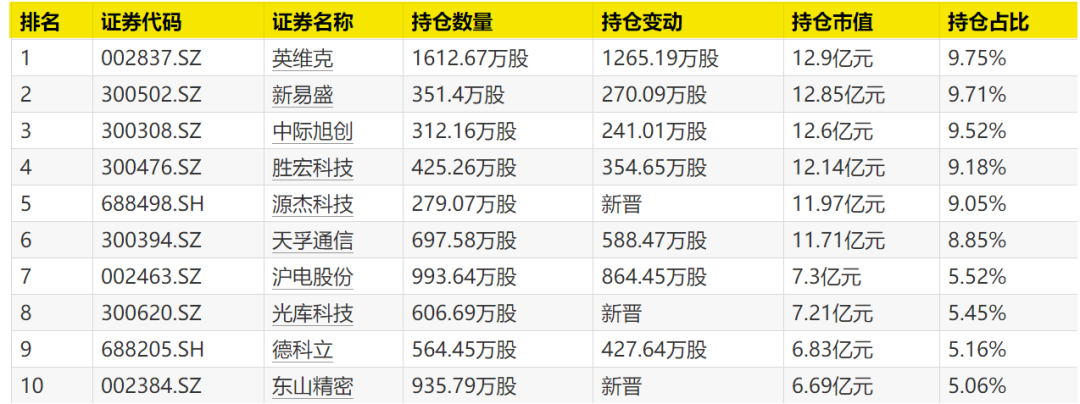 源杰科技、光库科技和东山精密“新晋”前十大重仓股。