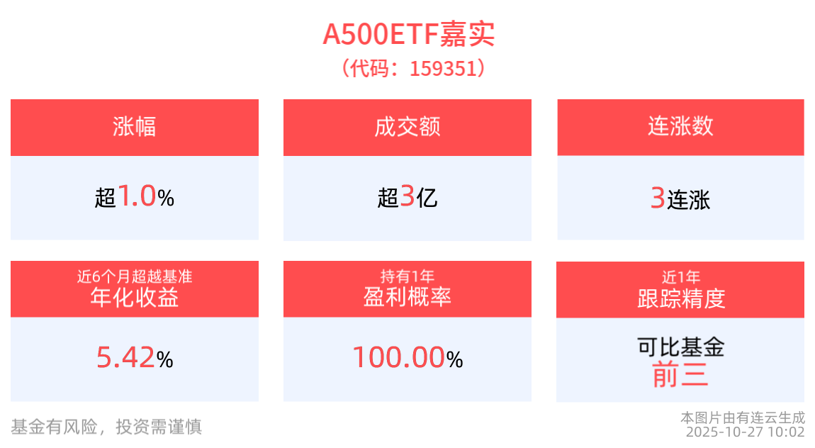 截至10月24日,A500ETF嘉实近1年净值上涨23.55%。从收益能力看,截至2025年10月24日,A500ETF嘉实自成立以来,最高单月回报为11.71%,最长连涨月数为5个月,最长连涨涨幅为28.61%,上涨月份平均收益率为4.15%。截至2025年10月24日,A500ETF嘉实近6个月超越基准年化收益为5.42%。