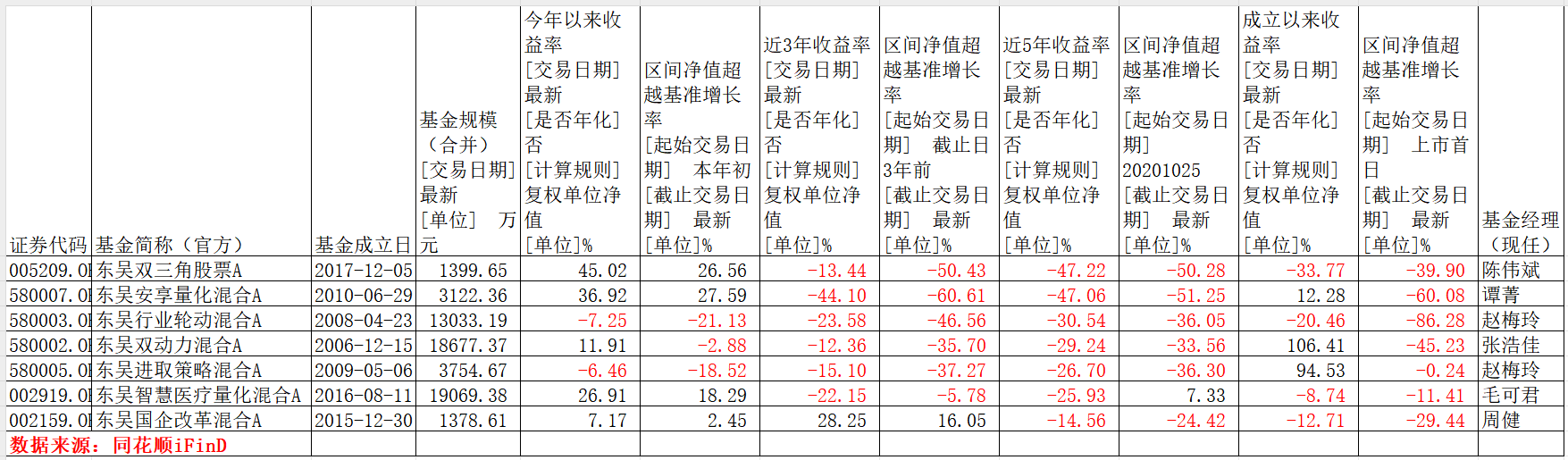 成立以来的收益率方面,东吴双三角股票A、东吴医疗服务股票A、东吴消费成长混合A、东吴行业轮动混合A、东吴国企改革混合A、东吴智慧医疗量化混合A等收益为负。其中,东吴双三角股票A表现最差,净值跌近34%;净值跌两成的东吴行业轮动混合A跑输同期基准收益率86个百分点。