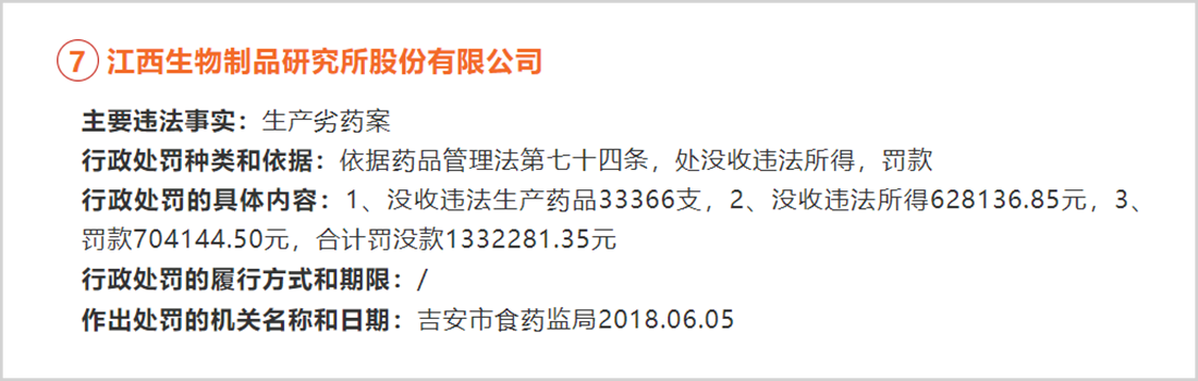 2018年,江西省吉安市药监局查实江西生物生产劣质药品,涉及产品包括破伤风抗毒素等。公司被没收违法生产药品33366支,没收违法所得62.81万元,并被罚款70.41万元,合计罚没款133.23万元。