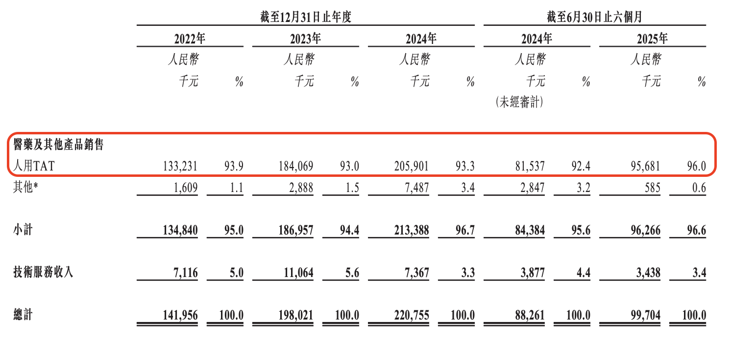 据悉,江西生物的主要收入来源为销售人用TAT,分别占公司截至2022年、2023年及2024年12月31日止年度以及截至2024年及2025年6月30日止六个月总收入的93.9%、93.0%、93.3%、92.4%及96.0%。