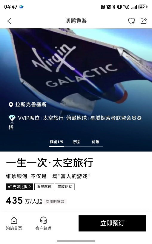 太空游的“极致”属性十分鲜明。作为“最远”的旅行,它能将参与者带离地球表面,进入亚轨道或更远空间,完成“走出地球”的终极体验。其“最贵”标签同样突出,以维珍银河亚轨道飞船体验产品为例,票价约60万美元(折合人民币435万元),客群主要集中在科技、金融、制造业等领域的企业家与投资人。同时,太空游“预约时间最长”的特点显著,从支付定金到最终成行需2至4年,漫长周期源于严格的健康筛查、专业培训,以及发射档期、舱位稀缺等因素,而这种稀缺性与严苛流程,更强化了其作为“人生里程碑”的仪式感与价值感。
