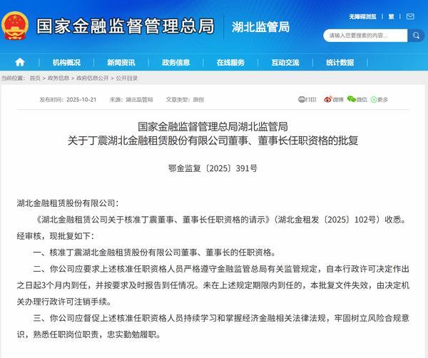 中国网财经10月27日讯日前,国家金融监督管理总局湖北监管局公布相关批复,核准丁震湖北金融租赁股份有限公司(简称“湖北金租”)董事、董事长的任职资格。以下是相关批复正文: