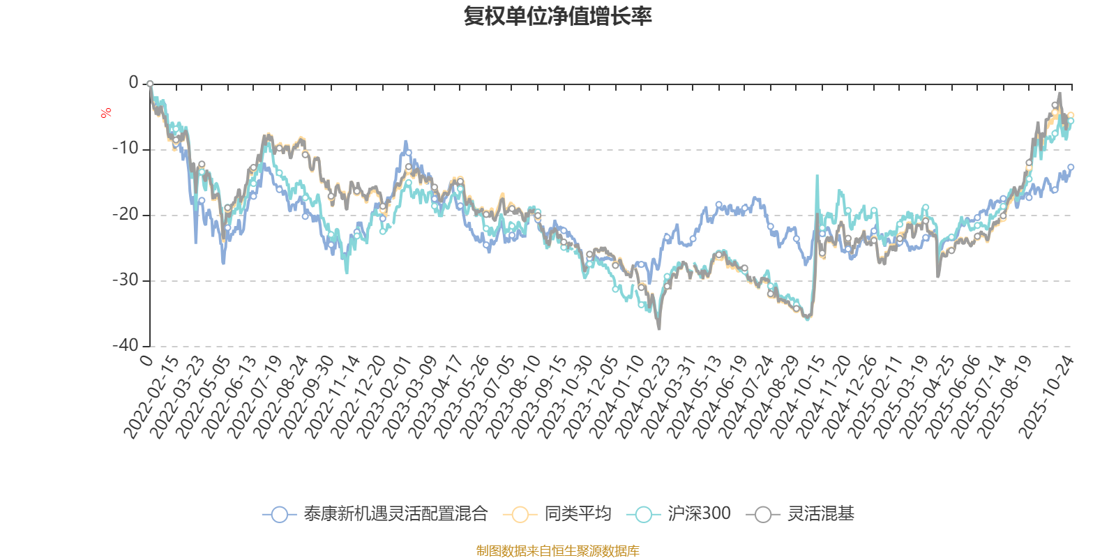 截至10月24日,泰康新机遇灵活配置混合近三个月复权单位净值增长率为4.43%,位于同类可比基金933/1287;近半年复权单位净值增长率为14.00%,位于同类可比基金896/1287;近一年复权单位净值增长率为12.36%,位于同类可比基金882/1287;近三年复权单位净值增长率为19.16%,位于同类可比基金507/1286。