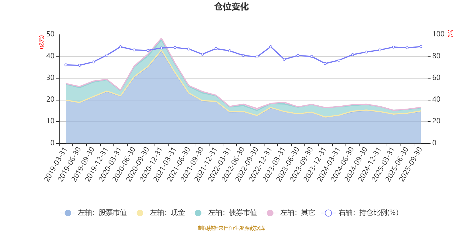 据定期报告数据统计,近三年平均股票仓位为82.82%,同类平均为72.19%。2025年三季度末基金达到88.99%的最高仓位,2019年上半年末最低,为71.8%。