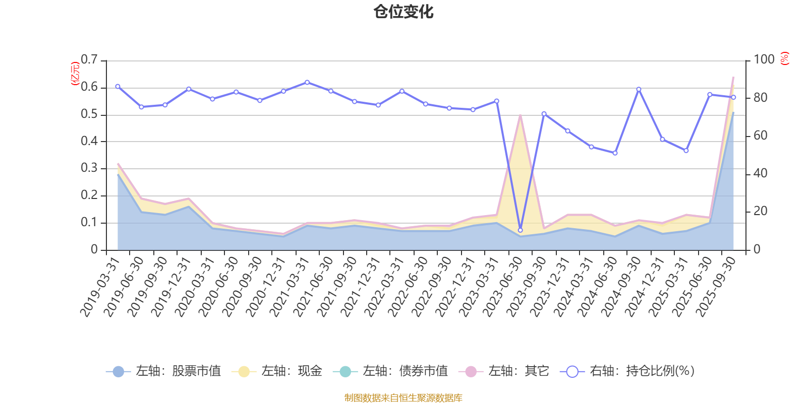 据定期报告数据统计,近三年平均股票仓位为63.49%,同类平均为72.16%。2021年一季度末基金达到88.46%的最高仓位,2023年上半年末最低,为10.51%。
