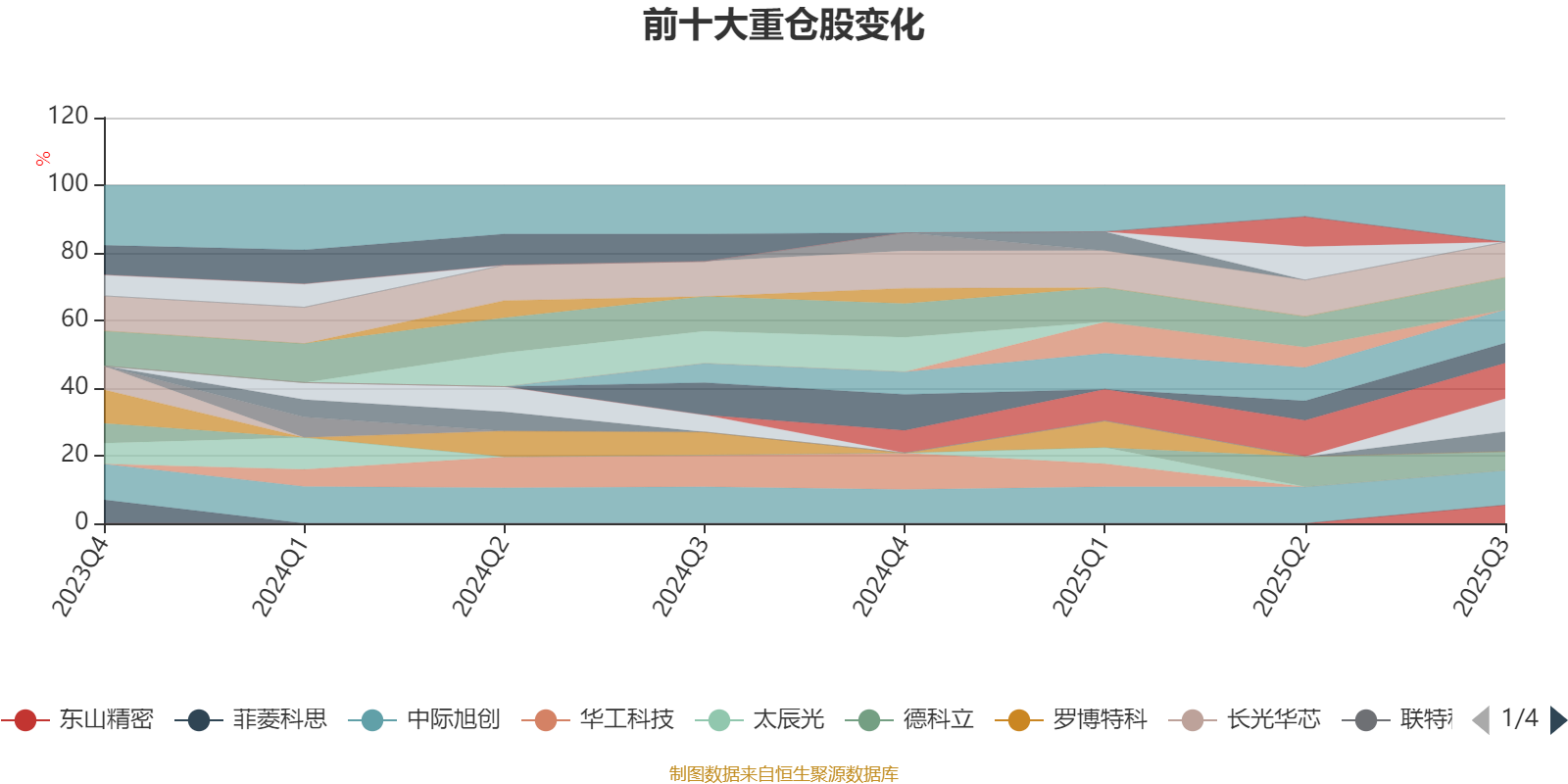 该基金持股集中度较高,近2年前十大重仓股集中度长期超过60%。截至2025年三季度末,基金十大重仓股分别是英维克、新易盛、中际旭创、胜宏科技、源杰科技、天孚通信、沪电股份、光库科技、德科立、东山精密。