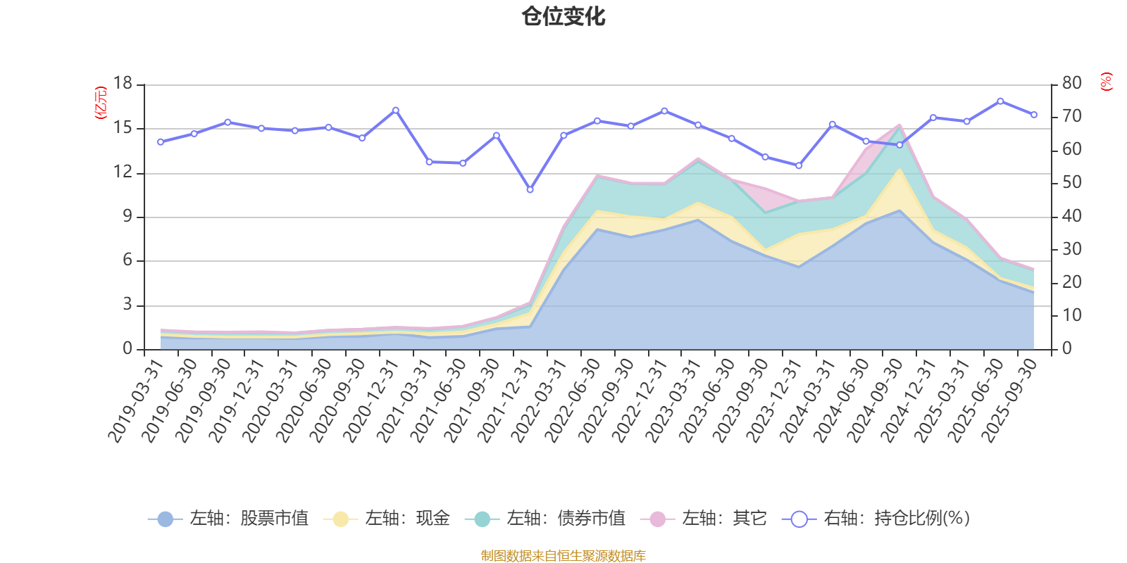 据定期报告数据统计,近三年平均股票仓位为66.19%,同类平均为72.19%。2025年上半年末基金达到74.95%的最高仓位,2021年末最低,为48.25%。