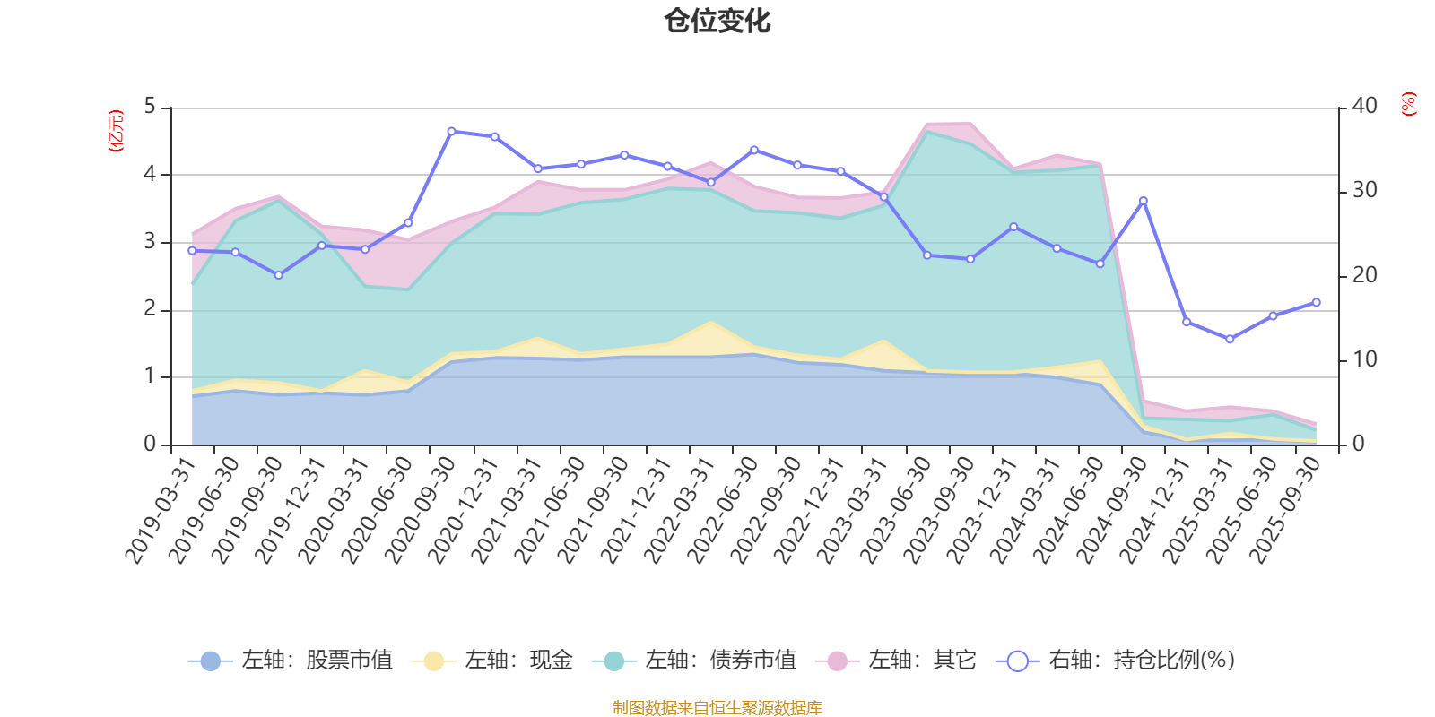据定期报告数据统计,近三年平均股票仓位为22.11%,同类平均为72.16%。2020年三季度末基金达到37.18%的最高仓位,2025年一季度末最低,为12.56%。