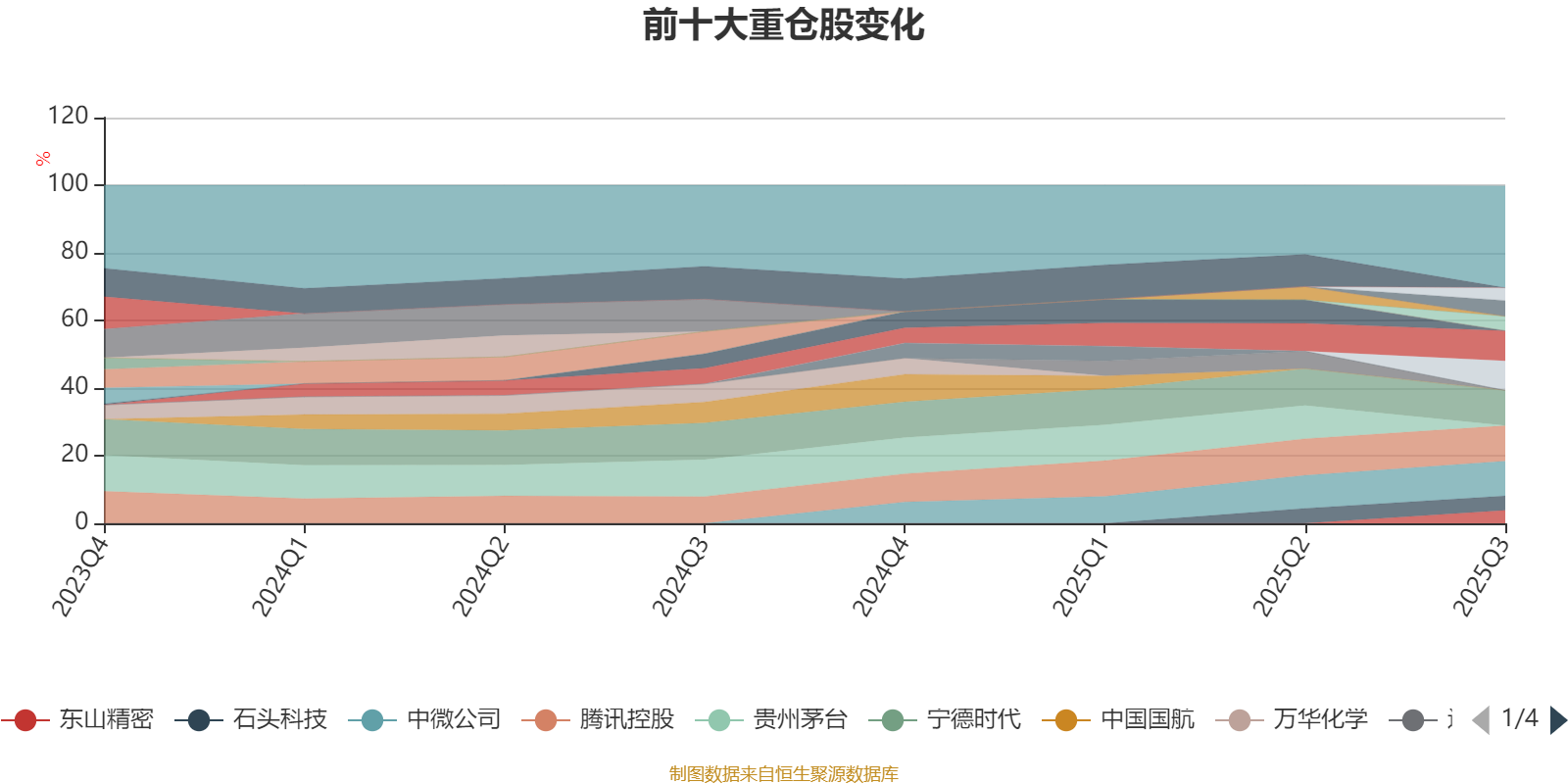 该基金持股集中度较高,近2年前十大重仓股集中度长期超过60%。截至2025年三季度末,基金十大重仓股分别是腾讯控股、宁德时代、中微公司、翰森制药、药明康德、新易盛、药明生物、石头科技、东山精密、先声药业。