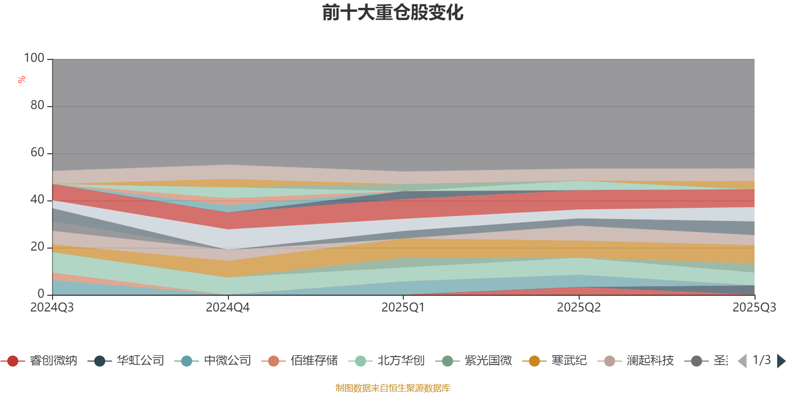 该基金持股集中度较高。截至2025年三季度末,基金十大重仓股分别是寒武纪、中芯国际、海光信息、豪威集团、北方华创、兆易创新、澜起科技、华虹公司、紫光国微、瑞芯微。