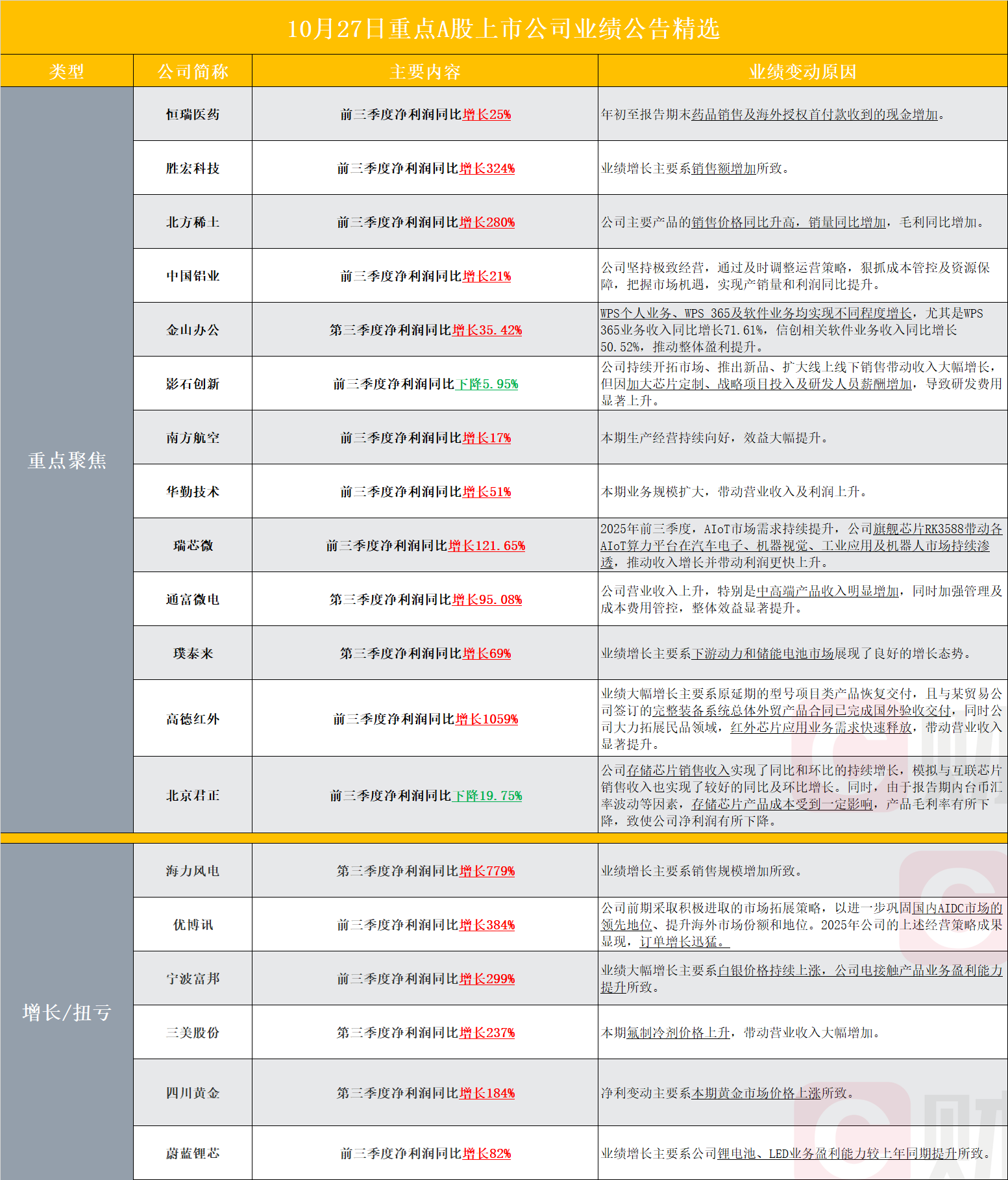据不完全统计,截至发稿,盘后包括恒瑞医药、胜宏科技、北方稀土、中国铝业、金山办公、影石创新、南方航空、华勤技术、瑞芯微、通富微电、璞泰来、高德红外、北京君正、海力风电、优博讯、宁波富邦、三美股份、四川黄金、蔚蓝锂芯等多家A股上市公司发布2025年三季度业绩报告。其中,恒瑞医药前三季度净利润同比增长25%,胜宏科技前三季度净利润同比增长324%。