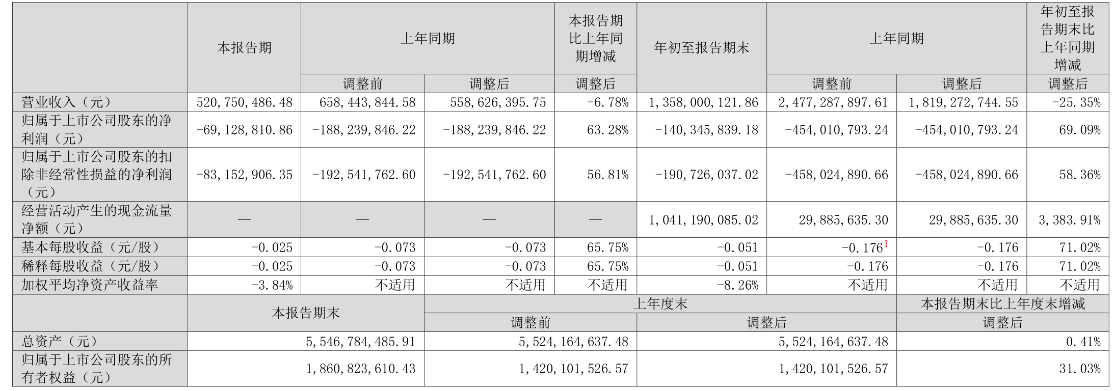 中证智能财讯中利集团(002309)10月28日披露2025年第三季度报告。前三季度公司实现营业总收入13.58亿元,同比下降25.35%;归母净利润亏损1.4亿元,上年同期亏损4.54亿元;扣非净利润亏损1.91亿元,上年同期亏损4.58亿元;经营活动产生的现金流量净额为10.41亿元,同比增长3383.91%;报告期内,中利集团基本每股收益为-0.051元,加权平均净资产收益率为-8.26%。