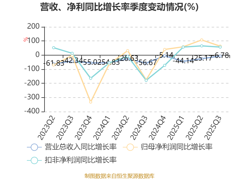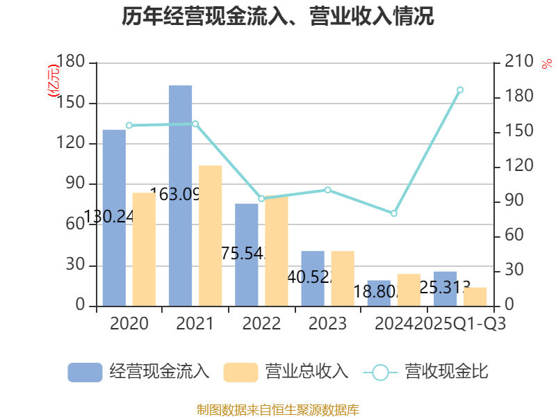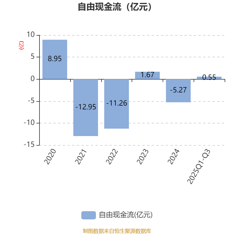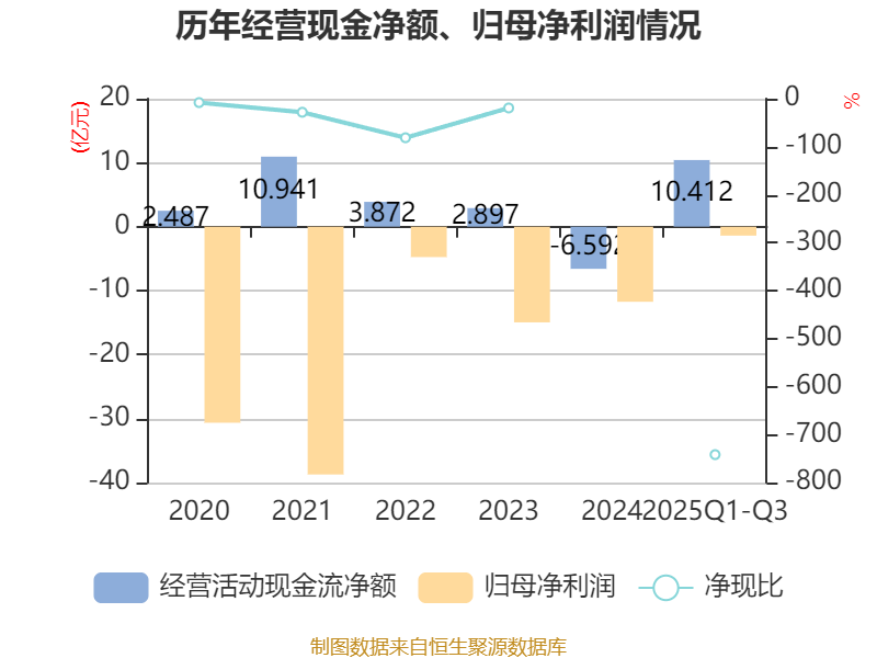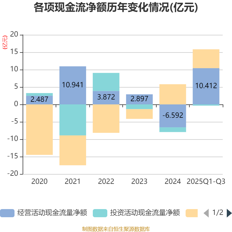 2025年前三季度,公司经营活动现金流净额为10.41亿元,同比增长3383.91%;筹资活动现金流净额5.42亿元,同比增加7.46亿元;投资活动现金流净额-3573.22万元,上年同期为1218.55万元。