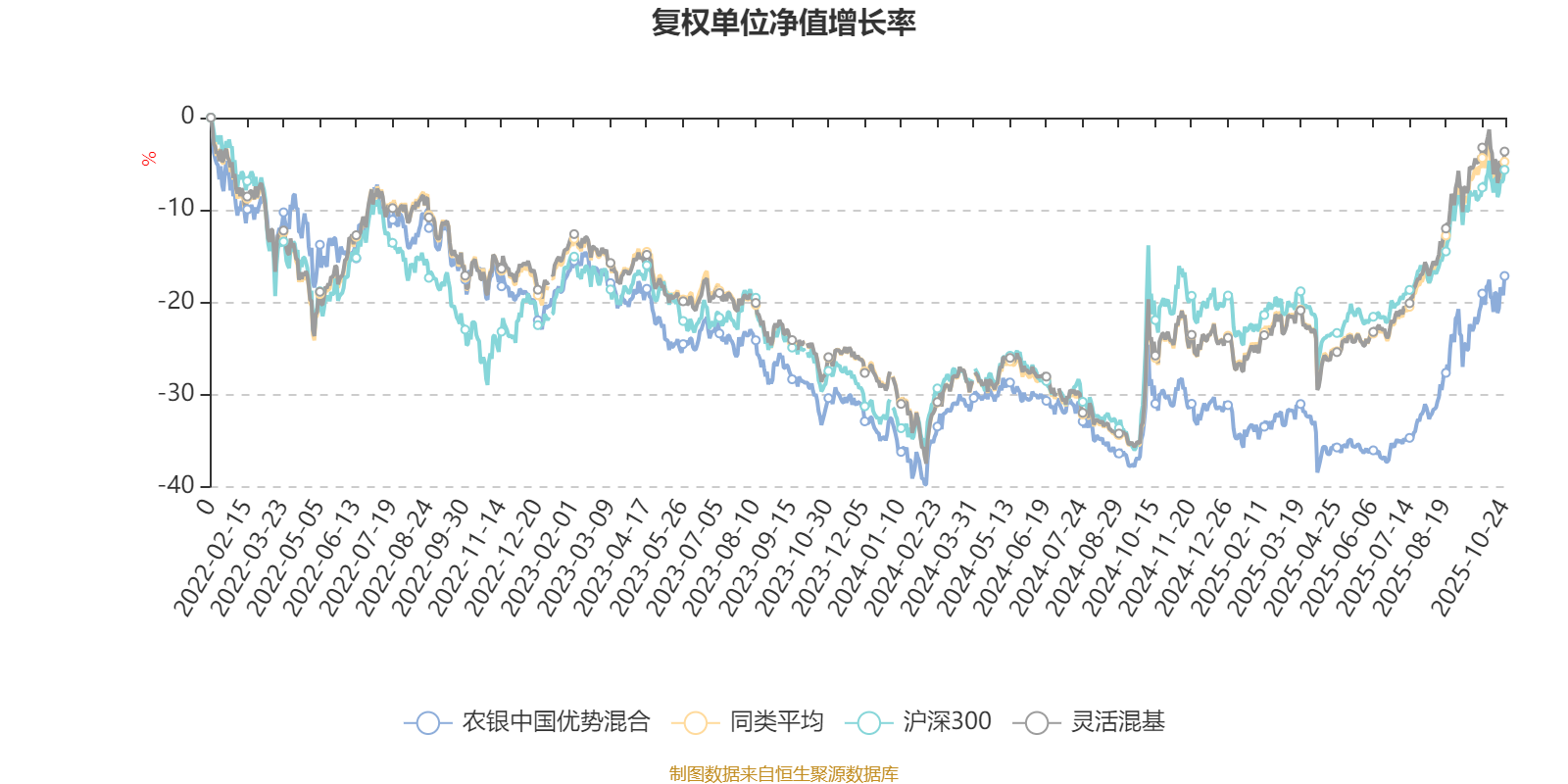截至10月24日,农银中国优势混合近三个月复权单位净值增长率为22.19%,位于同类可比基金302/1287;近半年复权单位净值增长率为28.90%,位于同类可比基金467/1287;近一年复权单位净值增长率为18.89%,位于同类可比基金712/1287;近三年复权单位净值增长率为0.08%,位于同类可比基金965/1286。