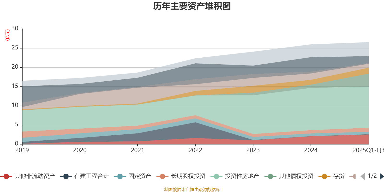 资产重大变化方面,截至2025年三季度末,公司其他债权投资较上年末增加298.09%,占公司总资产比重上升9.46个百分点;货币资金较上年末减少51.9%,占公司总资产比重下降7.71个百分点;交易性金融资产合计较上年末减少36.51%,占公司总资产比重下降2.42个百分点;投资性房地产较上年末减少2.59%,占公司总资产比重下降1.98个百分点。
