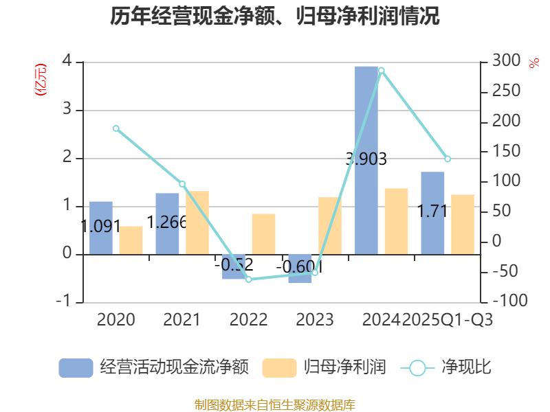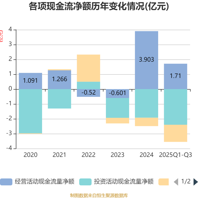 2025年前三季度,公司经营活动现金流净额为1.71亿元,同比增长314.21%;筹资活动现金流净额-1.15亿元,同比减少1.41亿元;投资活动现金流净额-2.4亿元,上年同期为-8190.35万元。