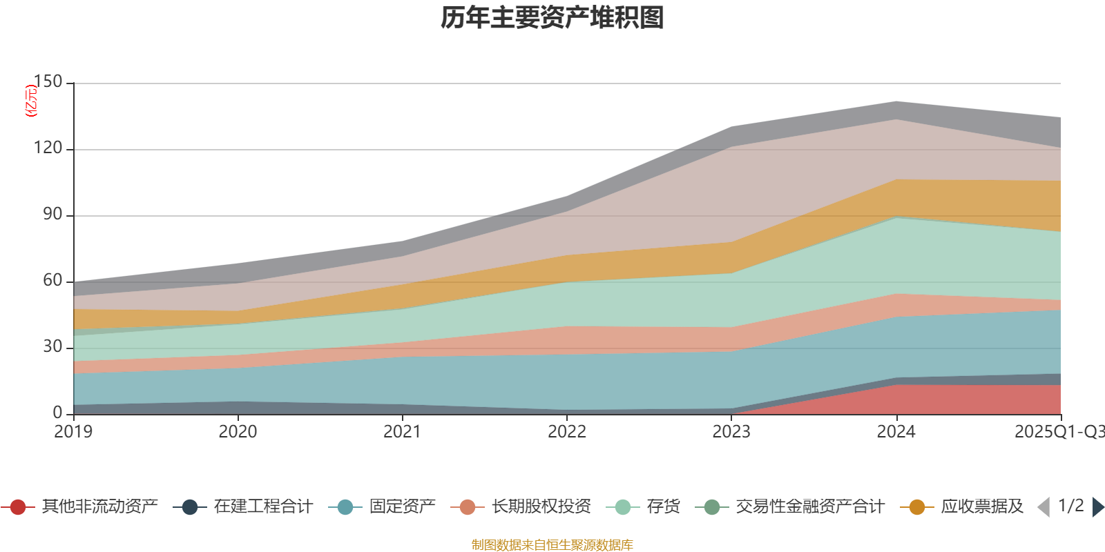 资产重大变化方面,截至2025年三季度末,公司货币资金较上年末减少45.43%,占公司总资产比重下降8.15个百分点;应收票据及应收账款较上年末增加39.41%,占公司总资产比重上升5.49个百分点;其他流动资产较上年末增加1770.72%,占公司总资产比重上升4.38个百分点;长期股权投资较上年末减少56.98%,占公司总资产比重下降4.09个百分点。