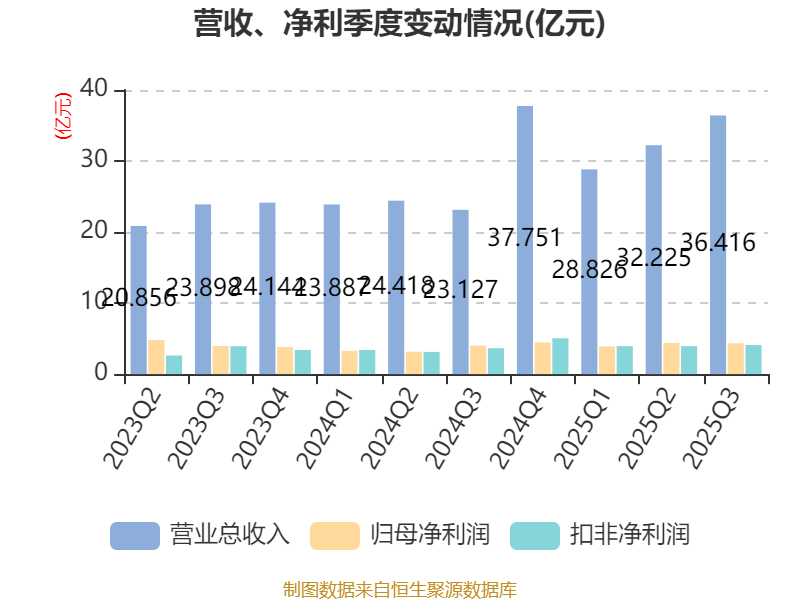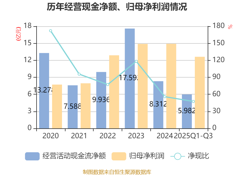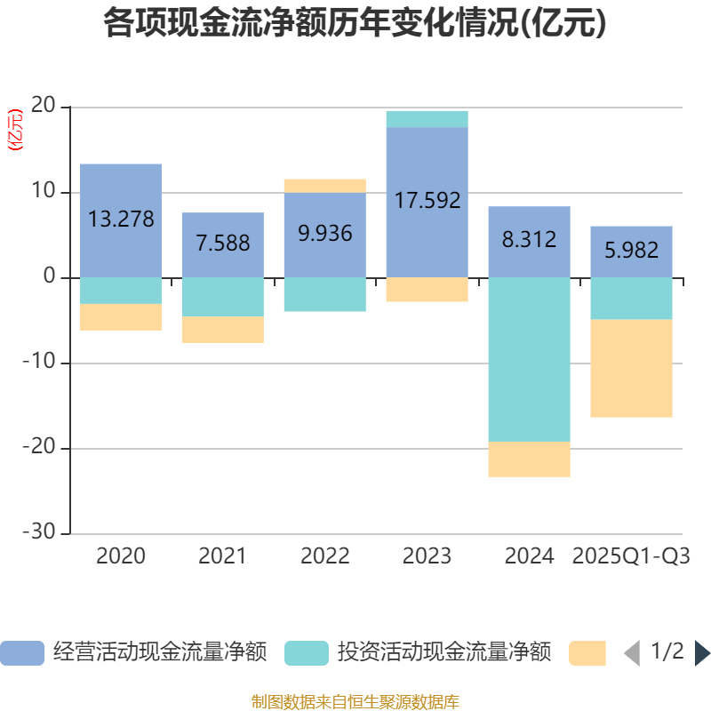 2025年前三季度,公司经营活动现金流净额为5.98亿元,同比增长61.63%;筹资活动现金流净额-11.46亿元,同比减少2.78亿元;投资活动现金流净额-4.97亿元,上年同期为-16.83亿元。