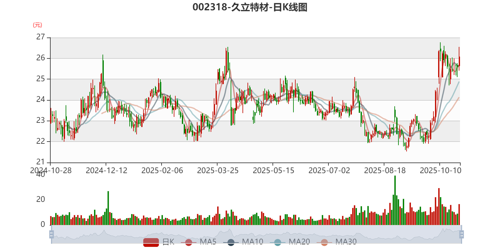 中证智能财讯久立特材(002318)10月28日披露2025年第三季度报告。前三季度公司实现营业总收入97.47亿元,同比增长36.45%;归母净利润12.62亿元,同比增长20.73%;扣非净利润11.97亿元,同比增长17.65%;经营活动产生的现金流量净额为5.98亿元,同比增长61.63%;报告期内,久立特材基本每股收益为1.33元,加权平均净资产收益率为15.95%。