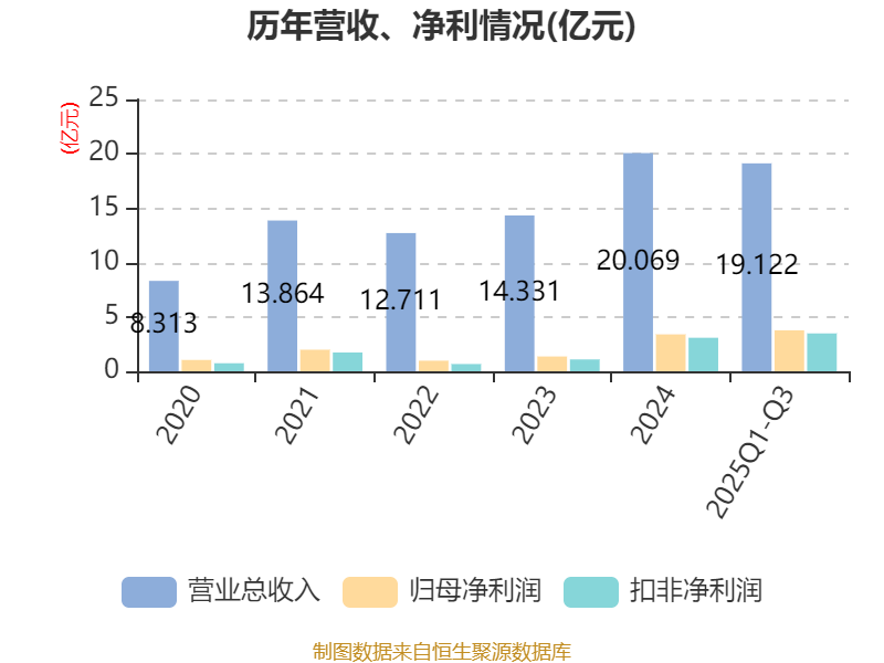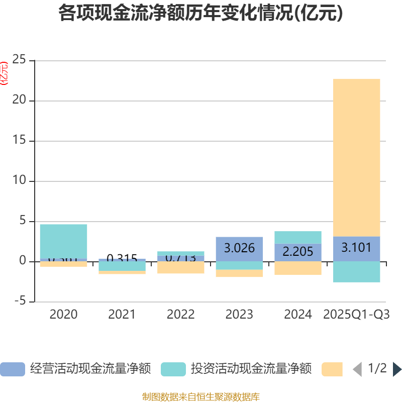 2025年前三季度,公司经营活动现金流净额为3.1亿元,同比增长238.32%;筹资活动现金流净额19.58亿元,同比增加21.26亿元;投资活动现金流净额-2.61亿元,上年同期为2.22亿元。