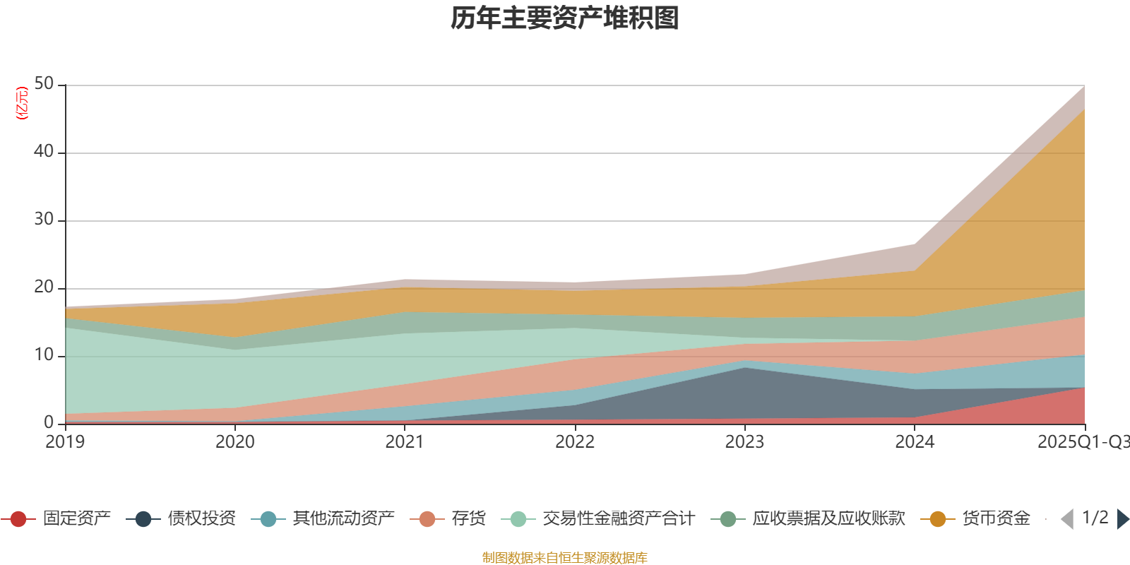 资产重大变化方面,截至2025年三季度末,公司货币资金较上年末增加296.91%,占公司总资产比重上升28.23个百分点;债权投资较上年末减少100%,占公司总资产比重下降15.61个百分点;固定资产较上年末增加469%,占公司总资产比重上升7.18个百分点;存货较上年末增加14.7%,占公司总资产比重下降7.15个百分点。