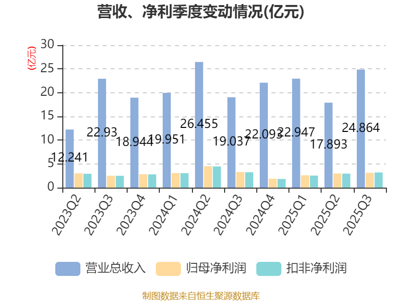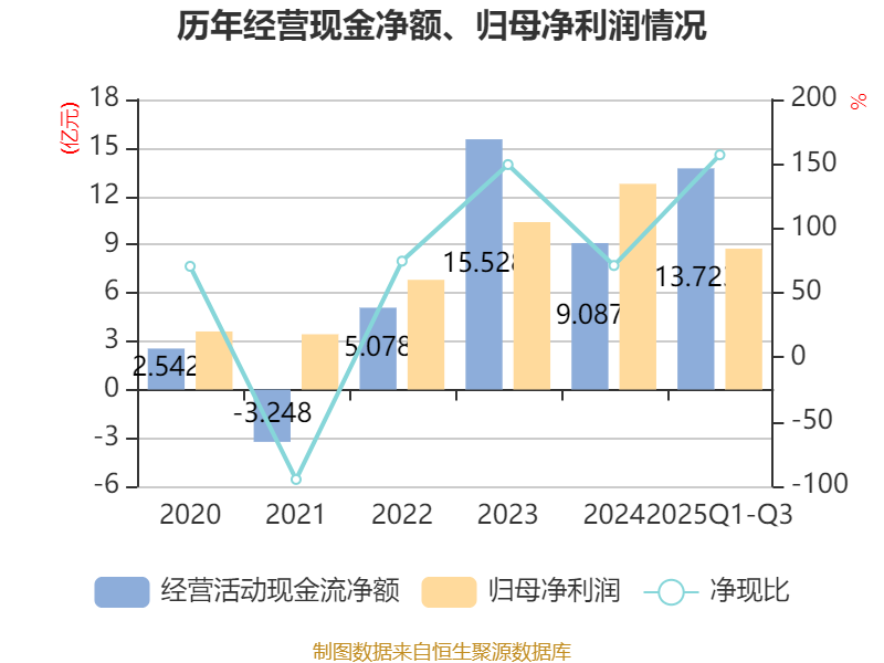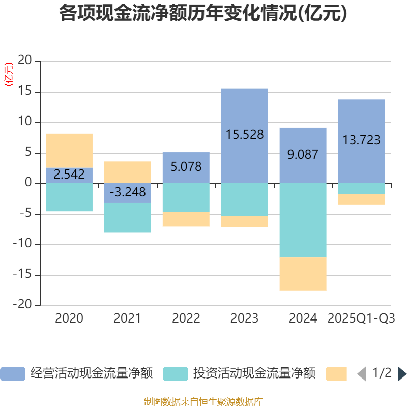 2025年前三季度,公司经营活动现金流净额为13.72亿元,同比增长50.6%;筹资活动现金流净额-1.69亿元,同比增加1.47亿元;投资活动现金流净额-1.8亿元,上年同期为-13.44亿元。