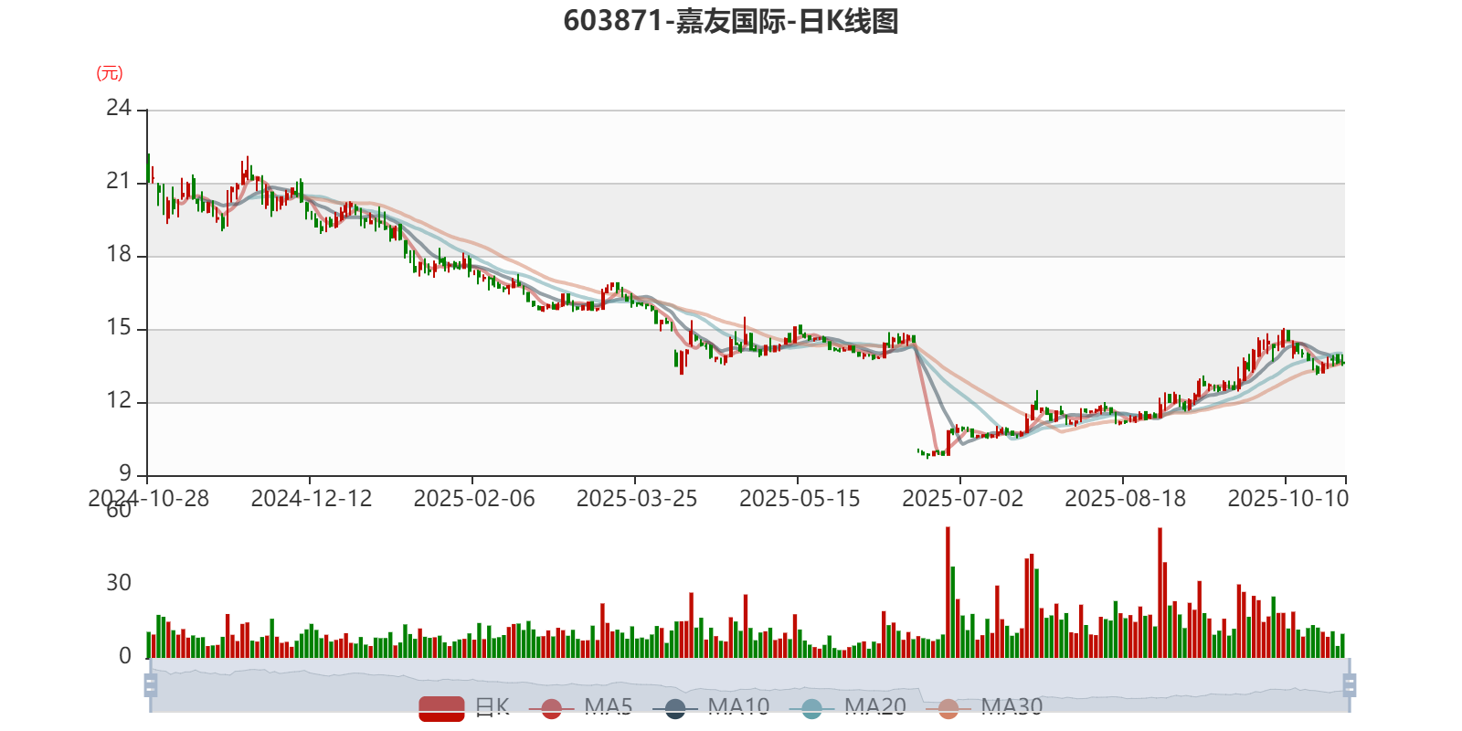 中证智能财讯嘉友国际(603871)10月28日披露2025年第三季度报告。前三季度公司实现营业总收入65.7亿元,同比增长0.40%;归母净利润8.74亿元,同比下降19.72%;扣非净利润8.71亿元,同比下降19.14%;经营活动产生的现金流量净额为13.72亿元,同比增长50.60%;报告期内,嘉友国际基本每股收益为0.64元,加权平均净资产收益率为14.86%。