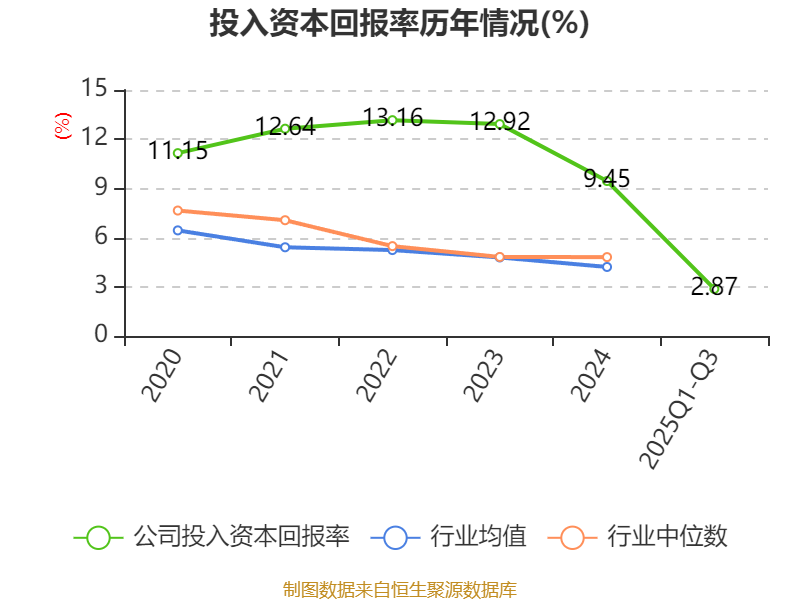 盈利能力方面, 2025年前三季度公司加权平均净资产收益率为3.61%,同比下降6.63个百分点。公司2025年前三季度投入资本回报率为2.87%,较上年同期下降3.39个百分点。