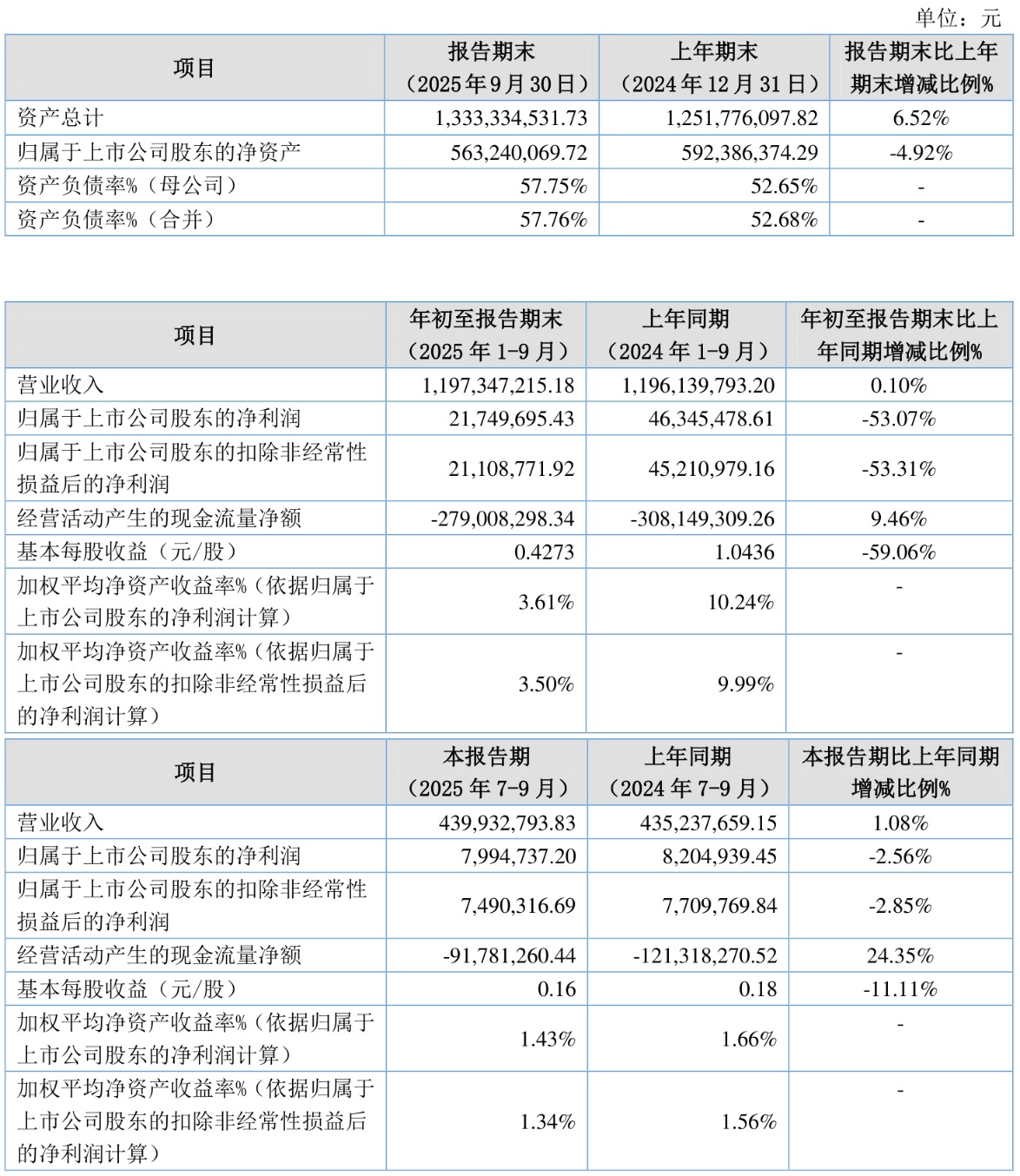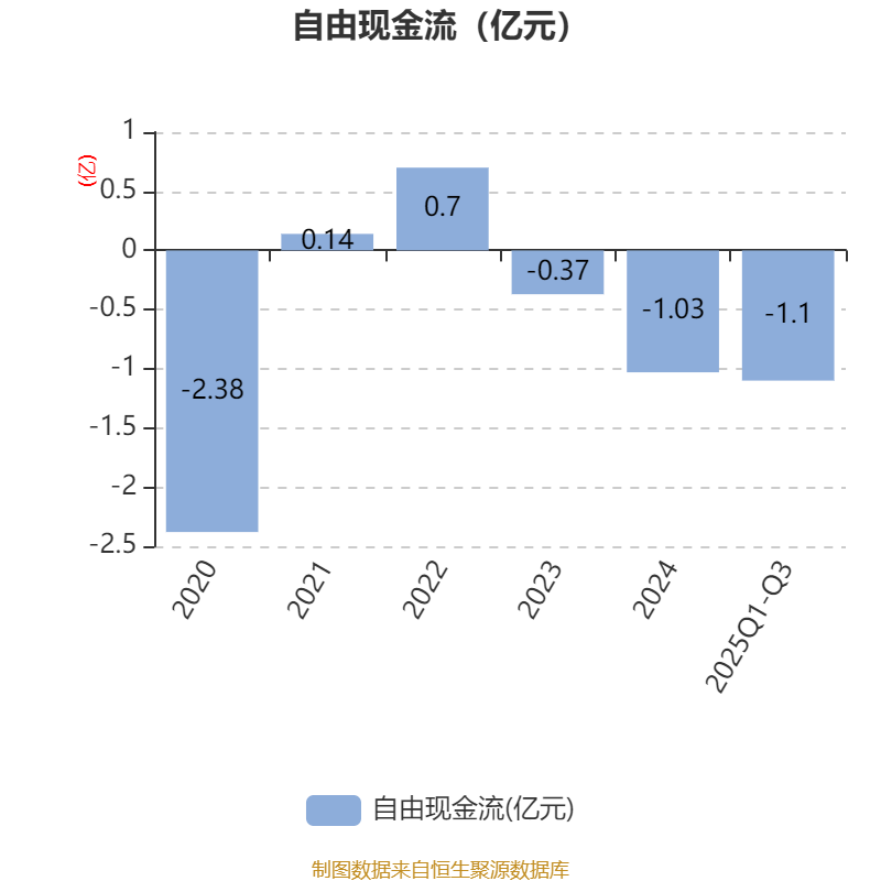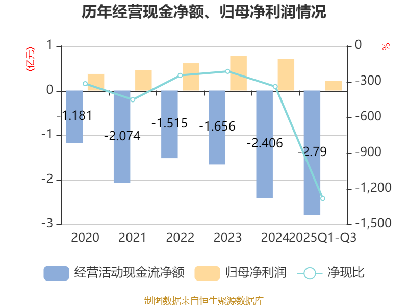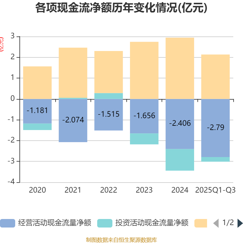 2025年前三季度,公司经营活动现金流净额为-2.79亿元,同比增加2914.1万元;筹资活动现金流净额2.13亿元,同比减少8798.11万元;投资活动现金流净额-2221.29万元,上年同期为-9009.65万元。