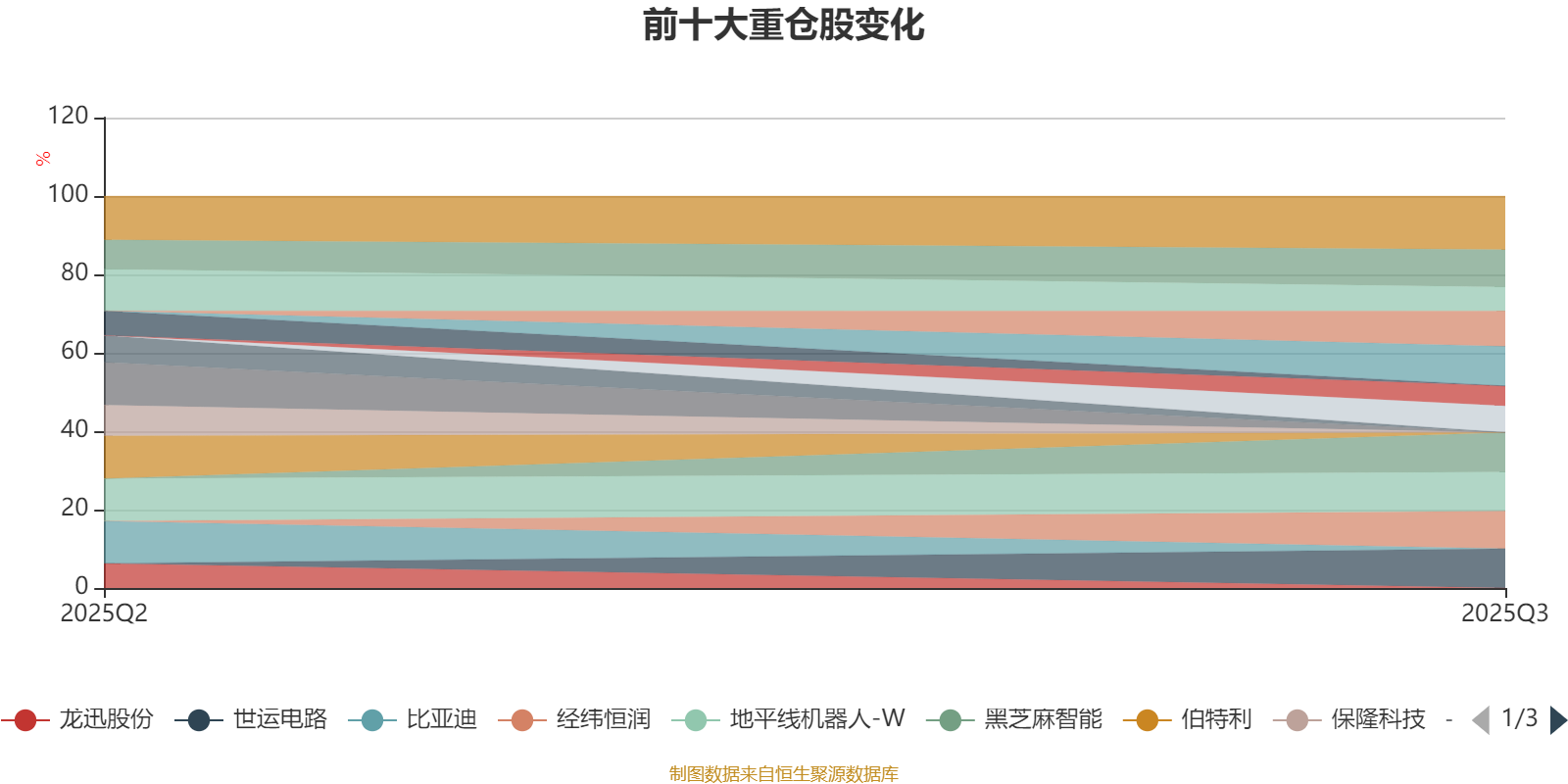 该基金持股集中度较高。截至2025年三季度末,基金十大重仓股分别是德赛西威、黑芝麻智能、世运电路、地平线机器人-W、经纬恒润、速腾聚创、新泉股份、商汤-W、小鹏汽车-W、北京君正。