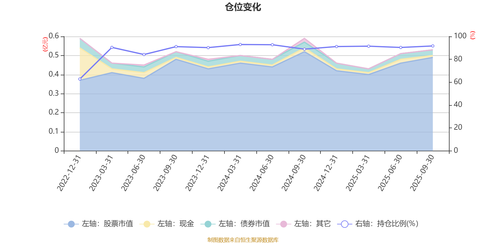据定期报告数据统计,近三年平均股票仓位为88.17%,同类平均为83.5%。2024年一季度末基金达到92.96%的最高仓位,2022年末最低,为62.76%。
