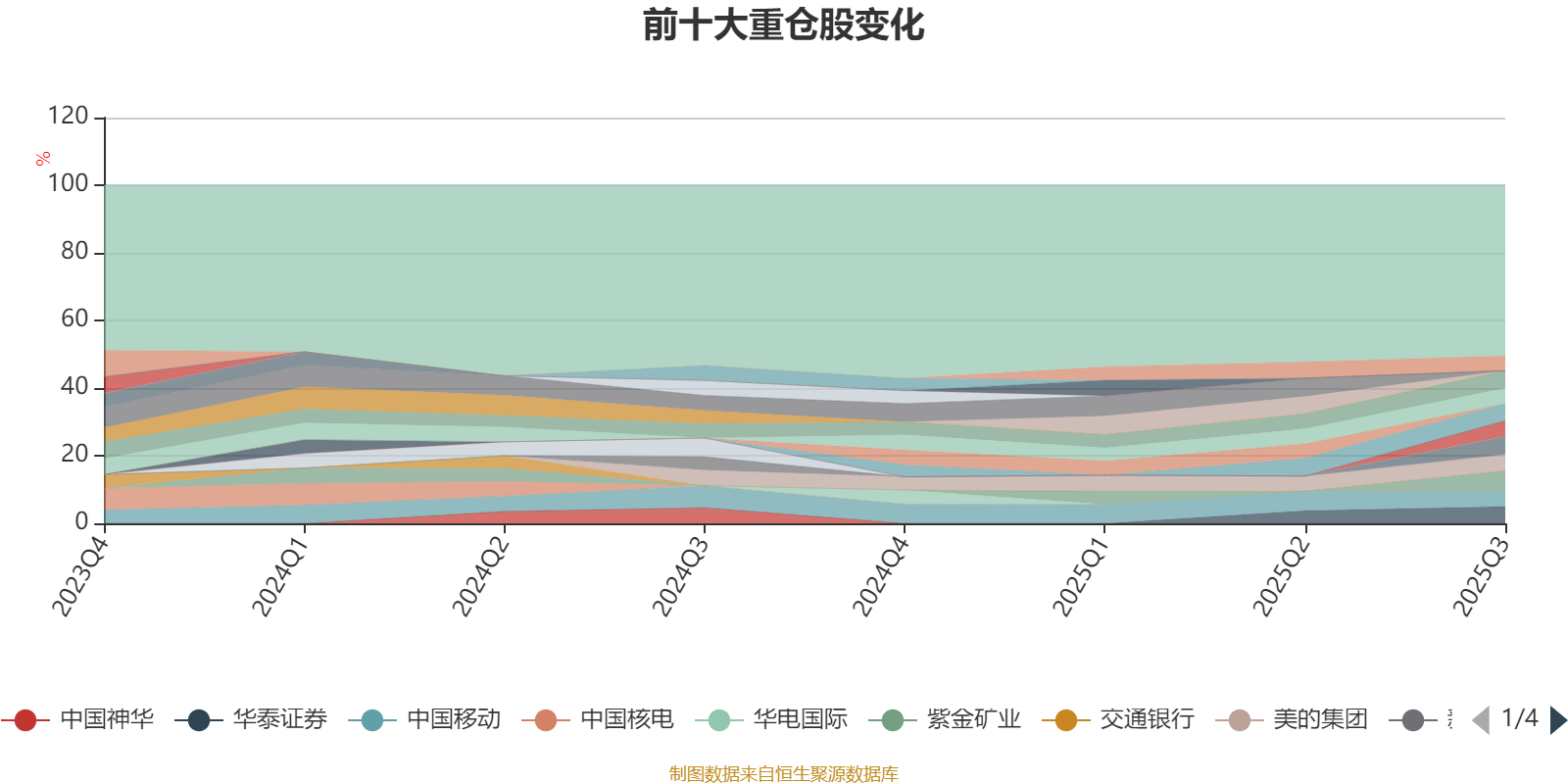 截至2025年三季度末,基金十大重仓股分别是紫金矿业、广发证券、农业银行、华泰证券、渝农商行、美的集团、福耀玻璃、工商银行、江苏银行、中国移动。