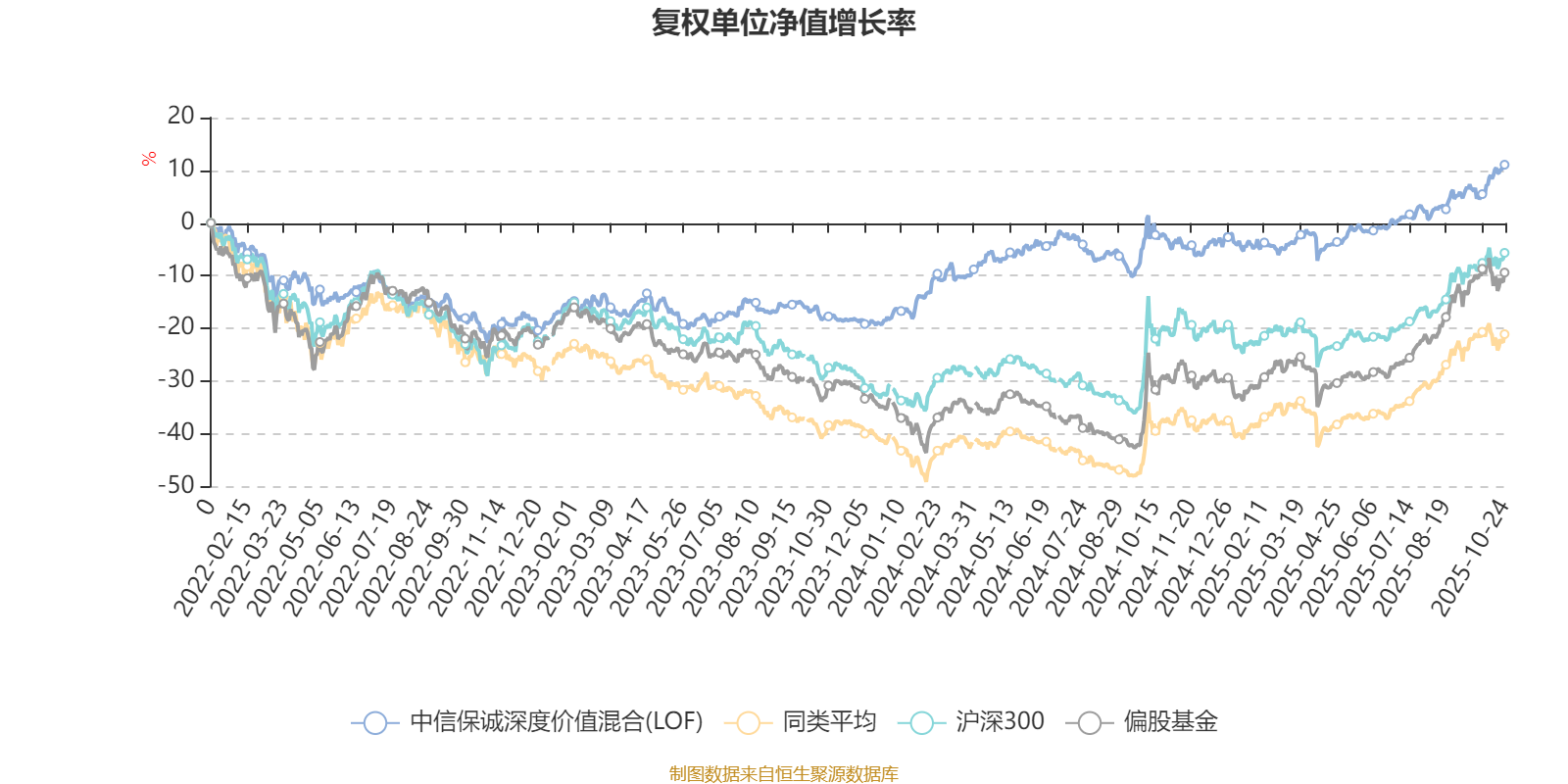 截至10月24日,中信保诚深度价值混合(LOF)近三个月复权单位净值增长率为7.47%,位于同类可比基金489/689;近半年复权单位净值增长率为15.39%,位于同类可比基金540/688;近一年复权单位净值增长率为13.78%,位于同类可比基金525/653;近三年复权单位净值增长率为39.50%,位于同类可比基金49/363。