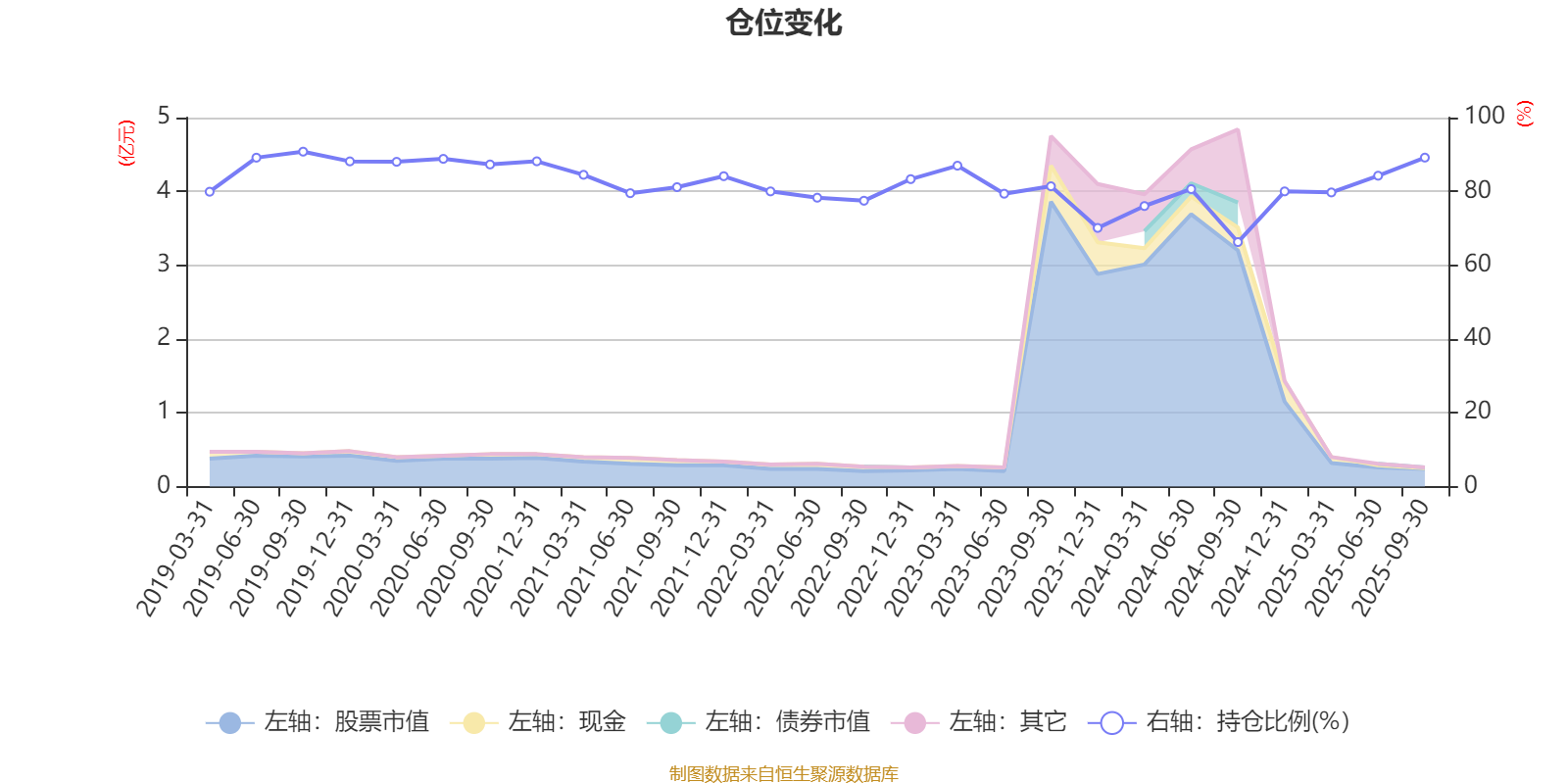 据定期报告数据统计,近三年平均股票仓位为79.77%,同类平均为83.5%。2019年三季度末基金达到90.77%的最高仓位,2024年三季度末最低,为66.26%。