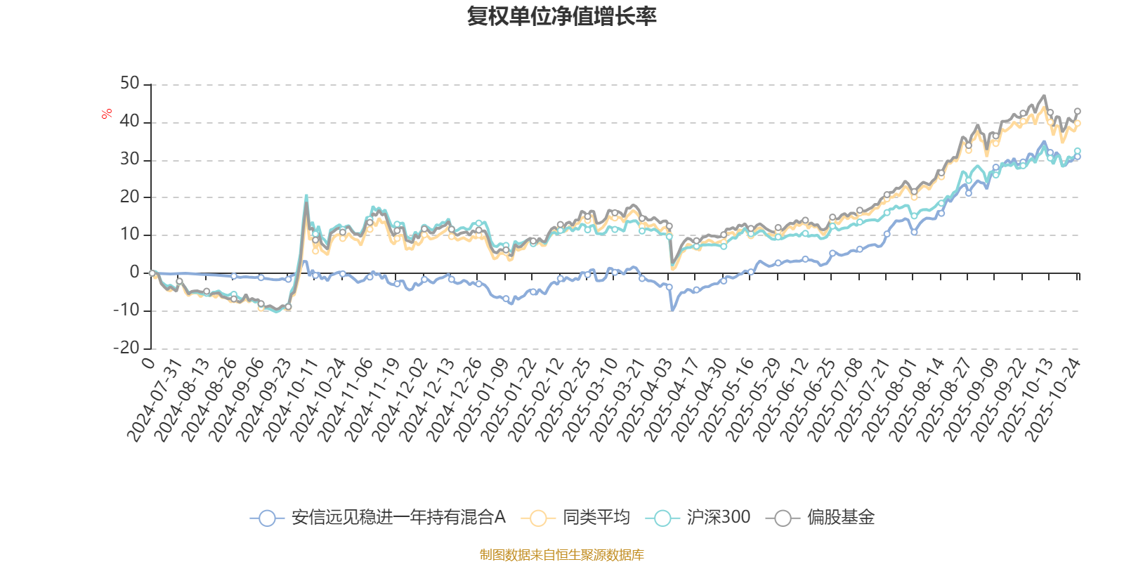 截至10月24日,安信远见稳进一年持有混合A近三个月复权单位净值增长率为14.91%,位于同类可比基金285/621;近半年复权单位净值增长率为34.99%,位于同类可比基金195/618;近一年复权单位净值增长率为31.09%,位于同类可比基金269/611。
