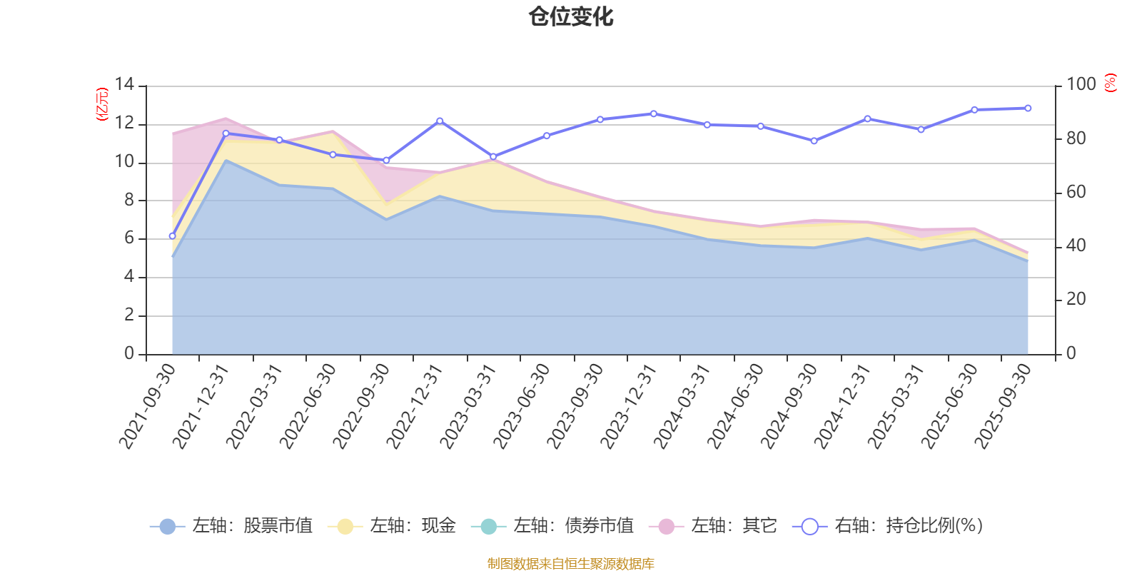 据定期报告数据统计,近三年平均股票仓位为85.22%,同类平均为85.88%。2025年三季度末基金达到91.62%的最高仓位,2021年三季度末最低,为44.05%。