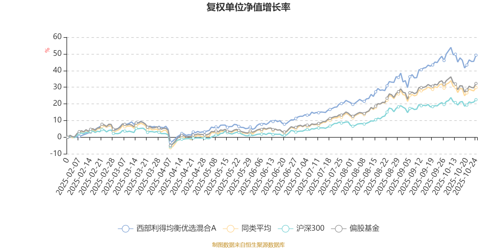 截至10月24日,西部利得均衡优选混合A近三个月复权单位净值增长率为24.43%,位于同类可比基金126/621;近半年复权单位净值增长率为44.97%,位于同类可比基金96/618。
